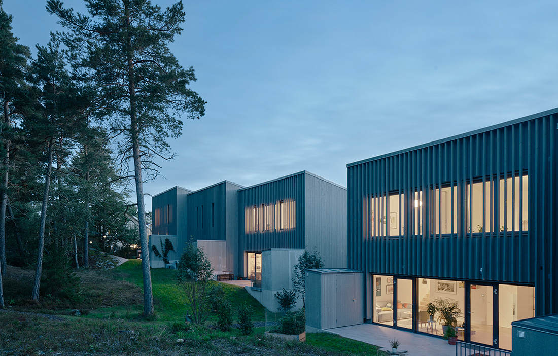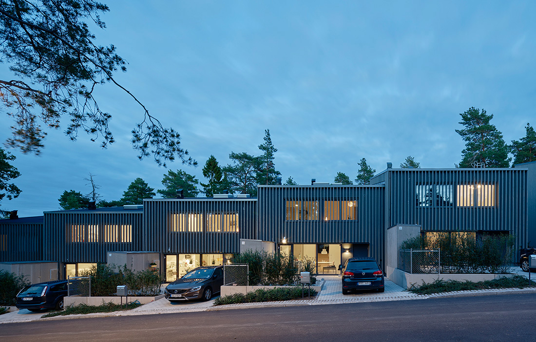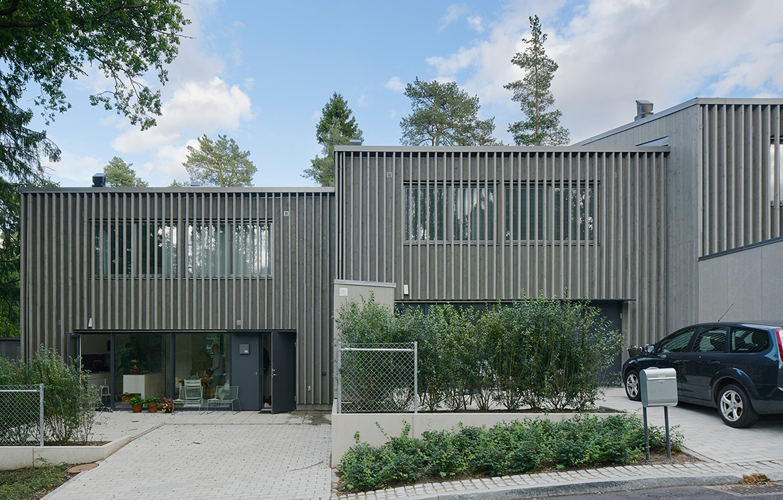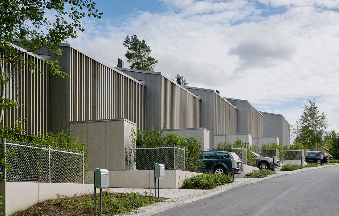 Även om radhusen är byggda med prefabricerade trästommar finns det en hög anpassning i projektet. Man har undvikt alla tydliga tecken på prefabricerat byggande där ett exempel är fasadens vertikala raster av grålaserad furupanel som är monterad i efterhand.