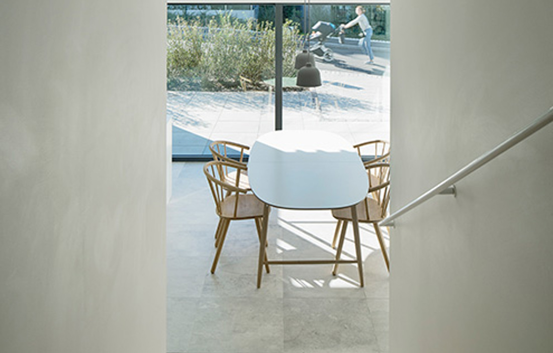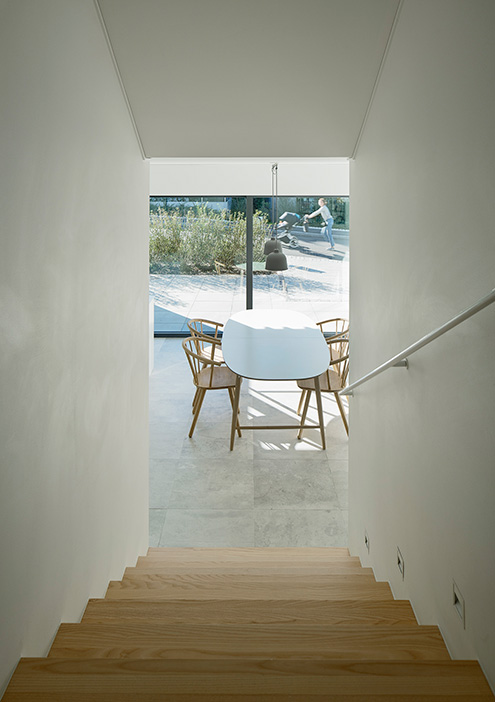 – Trapplösningen är verkligen en central del av huset. De många trapporna bidrar till att skapa en rörelse, och barnen som bor här tycker förstås att det är väldigt kul att springa i dem.