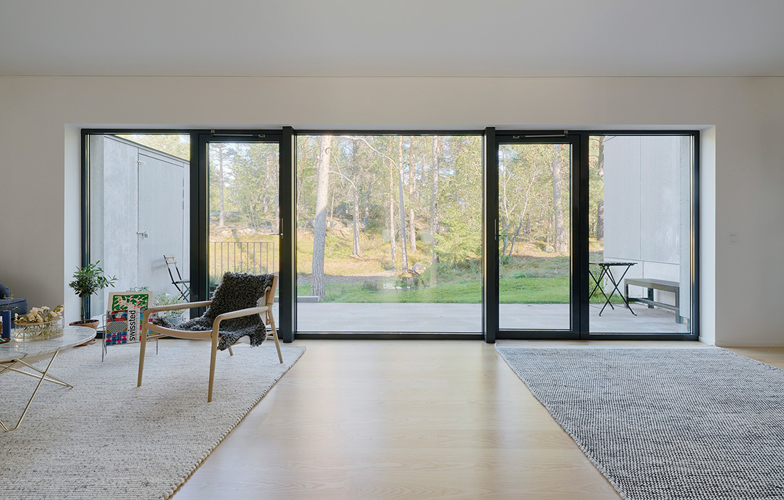 Ju högre upp i huset man kommer desto mindre blir transparensen i fasaden. Högst upp, i sovrummen, täcks fönstren delvis av de vertikala fasadribborna, vilket enligt Tomas Lauri inte är mycket konstigare än att ha en gardin.