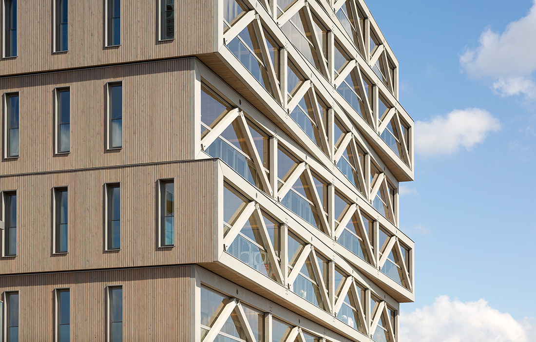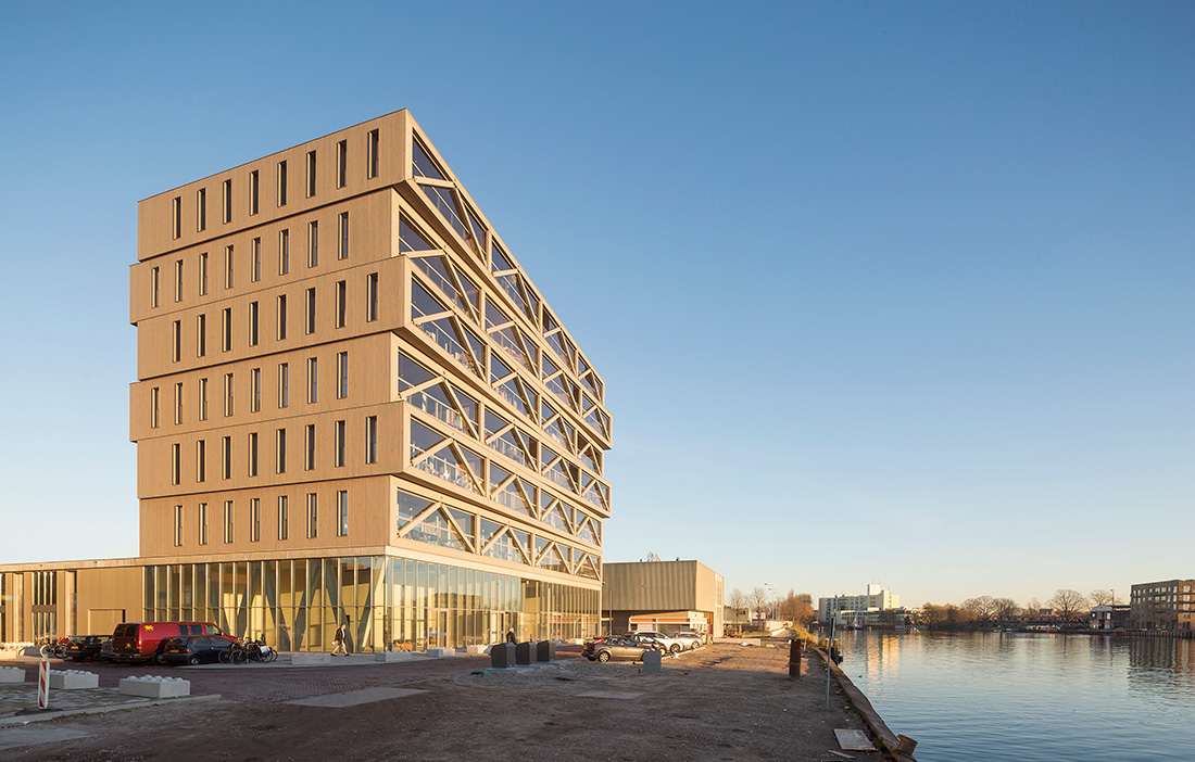 I den 30 meter höga konstruktionen har allt trä lämnats exponerat. Det gäller både den bärande pelar-balkkonstruktionen av limträ och väggarna av kl-trä. Bjälklaget är av betongplattor med specialformade I-balkar av stål för att möjliggöra den speciella lösningen. De nederländska byggnadsreglerna innebär att trapp-huset och hisschaktet behövde utformas i betong.