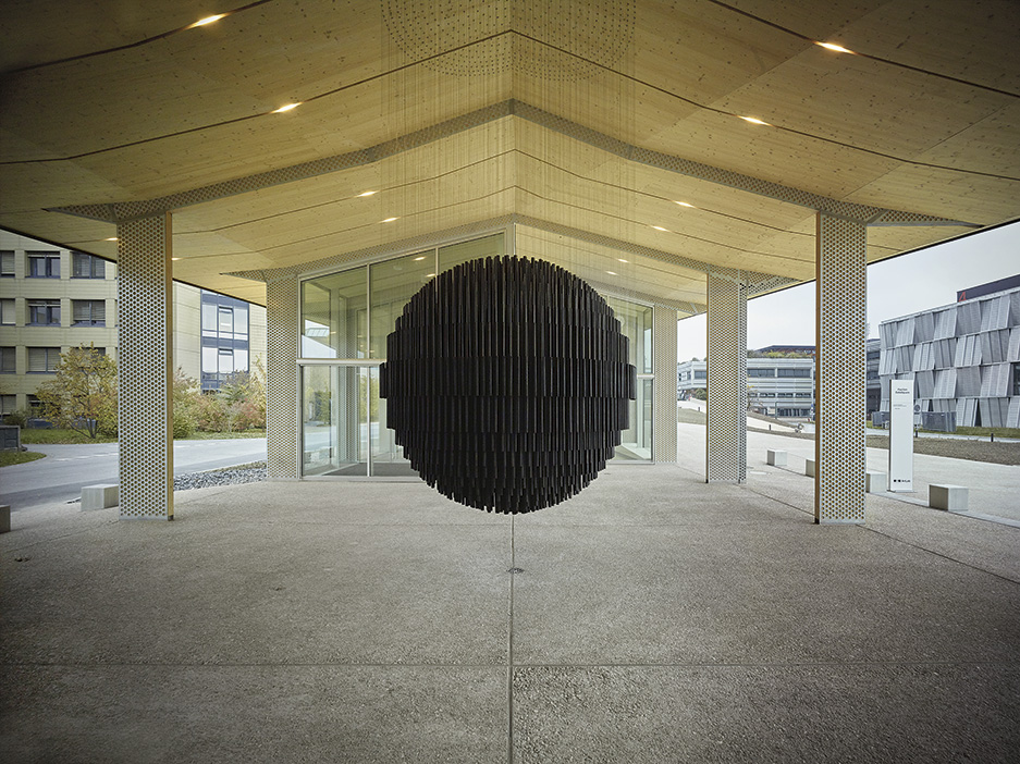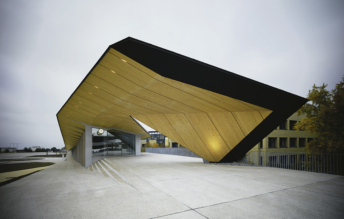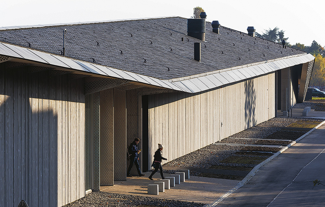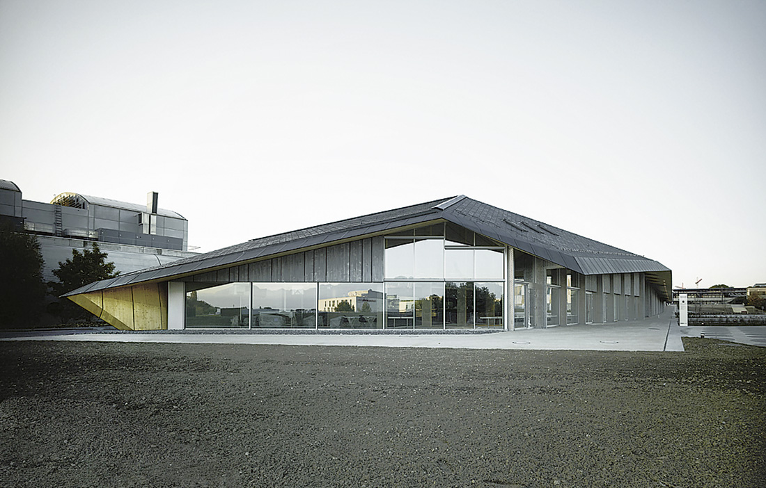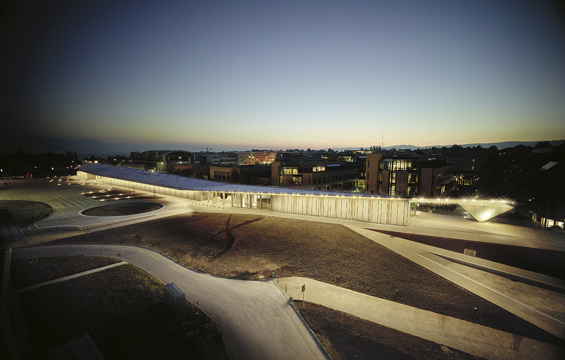 På natten är byggnaden smakfullt ljussatt, dagtid väl införlivad i övrig bebyggelse, utan att stå i vägen för utsikten mot Genèvesjön. Limträet och fasadpanelen är tillverkad av lärk som hämtats från närområdet.