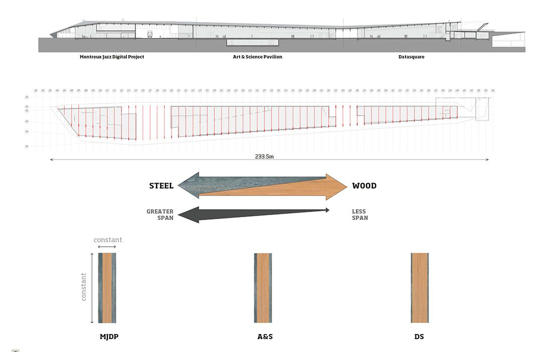 För konstruktionen, där alla spann har olika mått, har man tagit fram en helt ny teknisk lösning, med prefabricerade pelare och balkar med en kärna av trä täckt av stålpaneler som perforerats för att träkänslan inte ska gå förlorad. Proportionerna av respektive material är sedan anpassade efter takets bredd. Ju bredare spann desto mer stål. Och tvärtom. Därmed kan måtten på pelare och balkar till de totalt 57 portalerna, alltid uppsatta på 3,8 meters centrumavstånd från varandra, vara precis lika oavsett spannets längd.