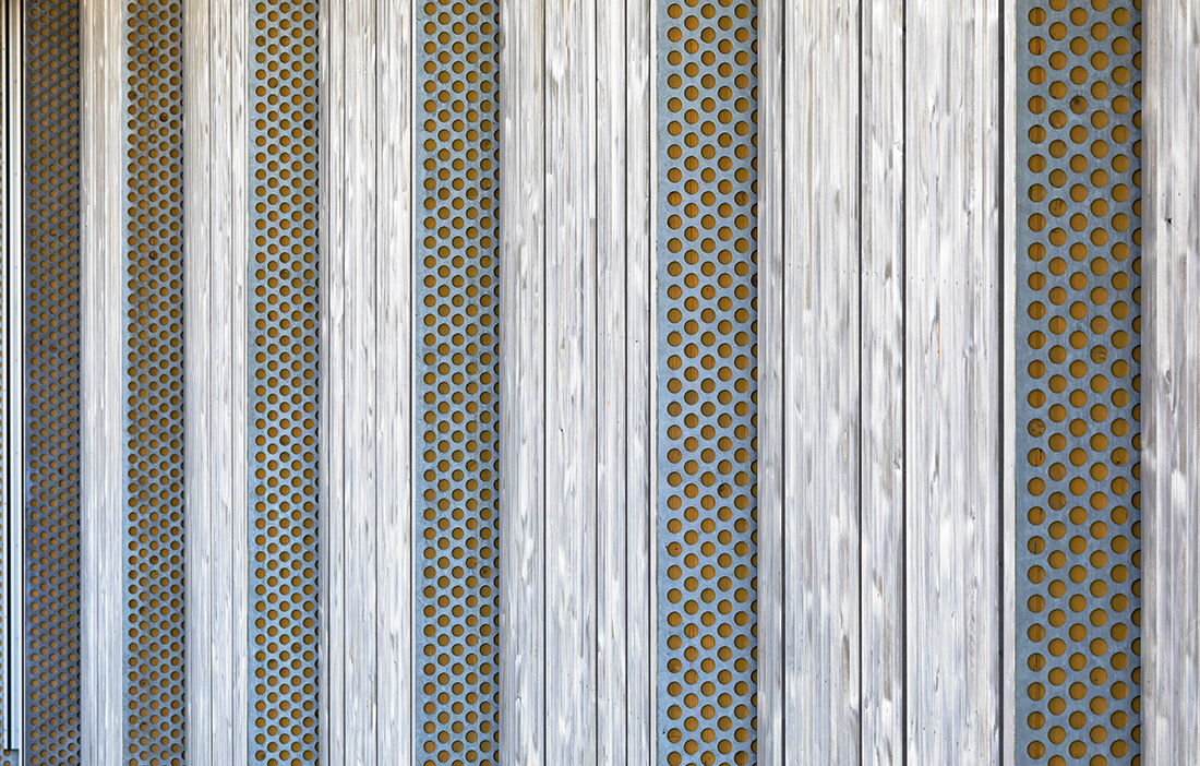 Fasaden är täckt med en ytterpanel av lärk. Men eftersom man här velat undvika att panelen blir flammig av ålder och väder har den behandlats för att se trägrå ut redan från början. Den homogent ljusgrå färgnyansen