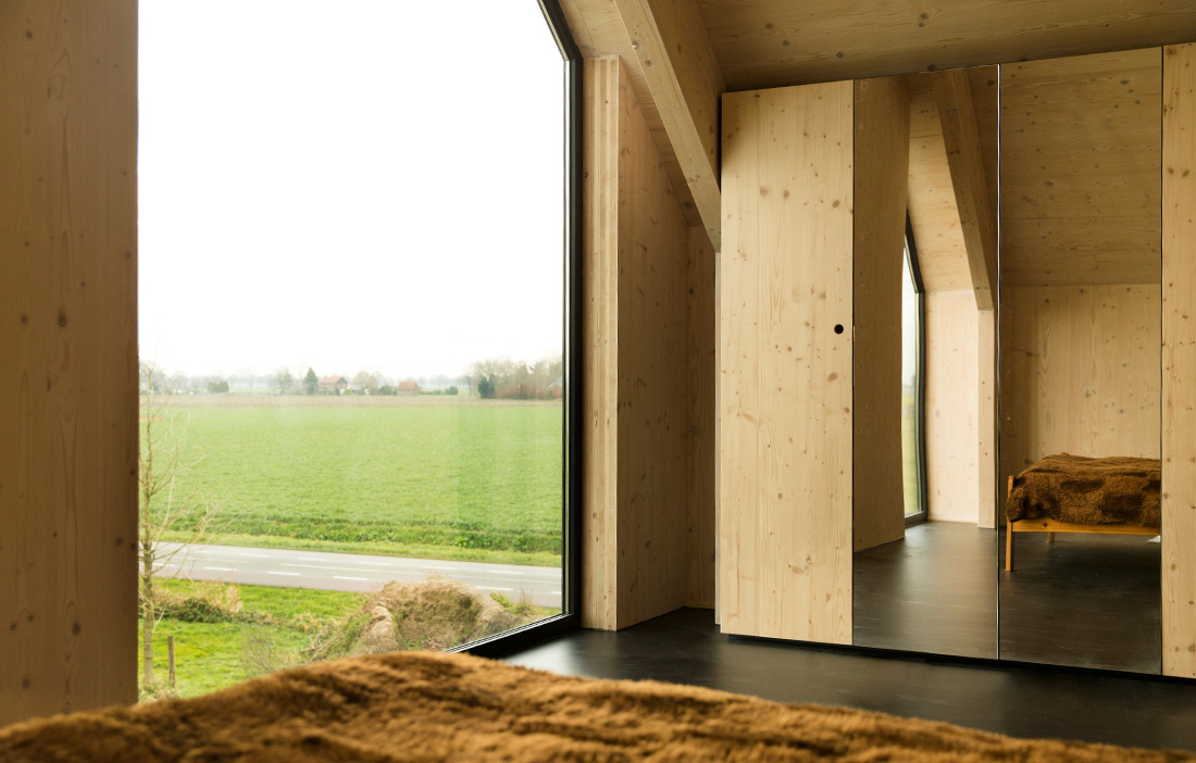– Vi har skapat utsiktspunkter och fönster från varje rum mot stallet och hagarna så att familjen alltid kan se hjortarna: när de vaknar, går och lägger sig, badar, lagar mat eller sitter vid tv:n. Eftersom all utsikt från huset är slående vacker ritade vi in kvadratiska fönster i två storlekar runt hela huset så att de kan se fält och ängar åt alla håll, men från olika vinklar beroende på om de ligger, sitter eller står, säger Sylvie Bruyninckx.