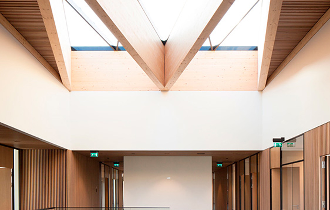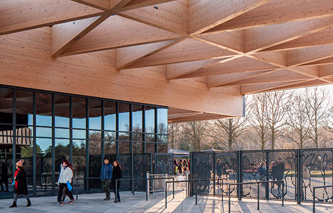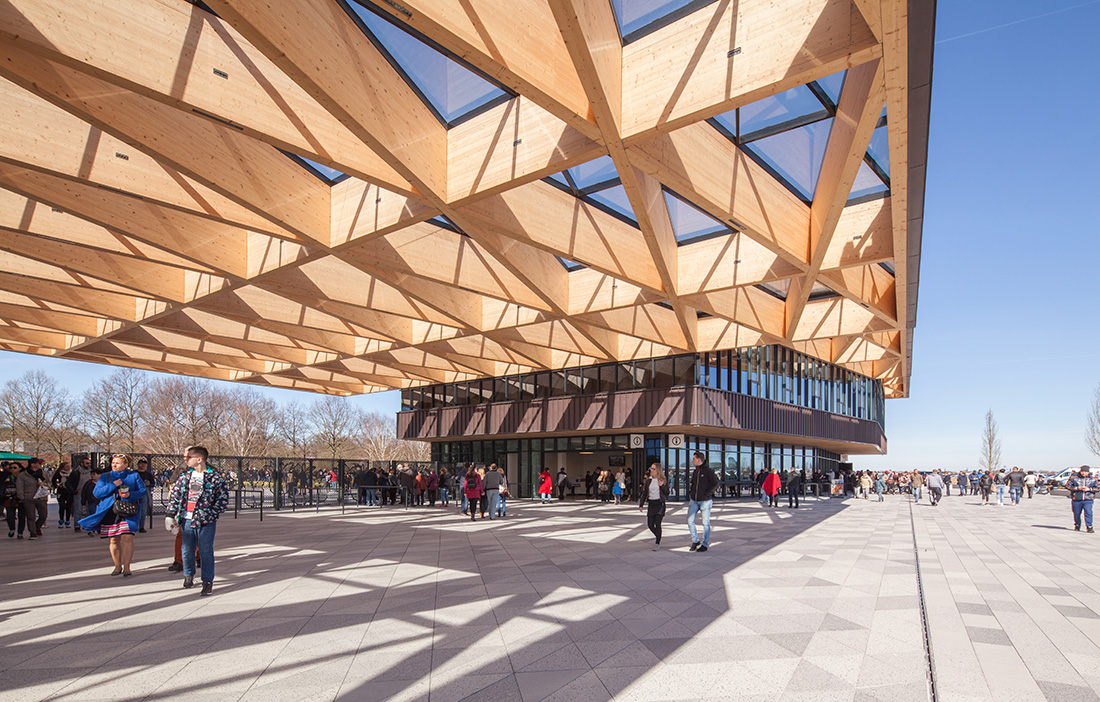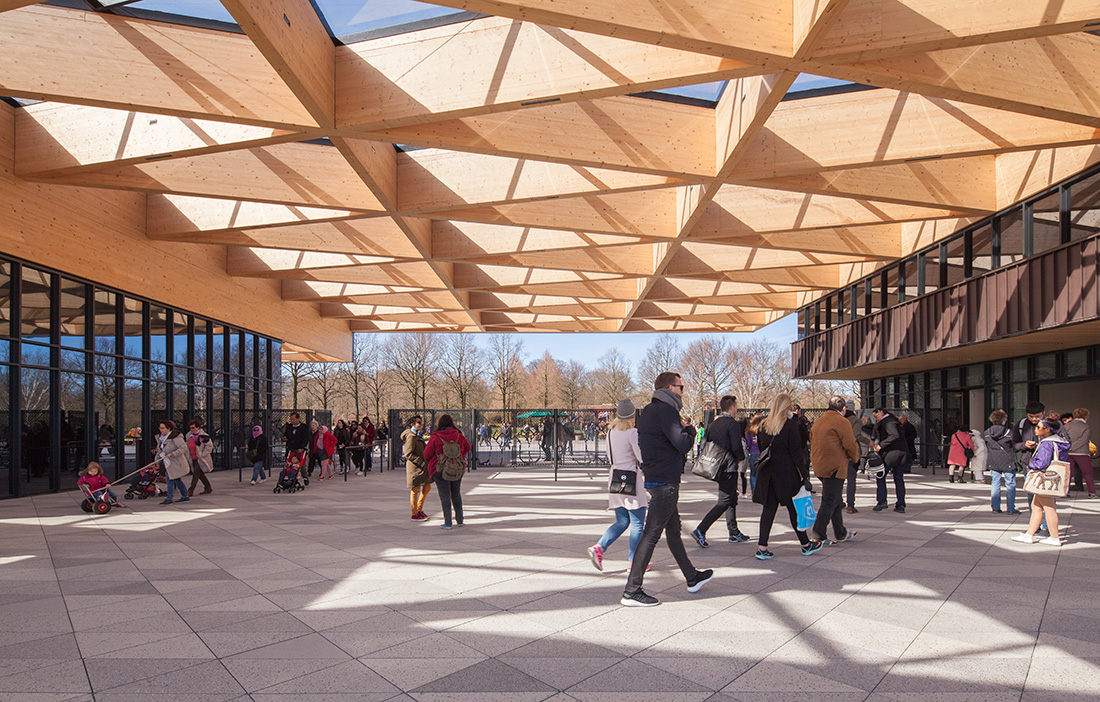 De stora limträbalkarna i sitt triangulära arrangemang är klädda med koppar. Glas täcker öppningarna i trianglarna vilket skapar skydd och samtidigt tillåter ett vackert skuggspel på marken. Den holländska firman Mecanoo Architekten ligger bakom det 3 200 kvadratmeter stora projektet som även inkluderade 1,3 hektar av landskapsarkitektur.