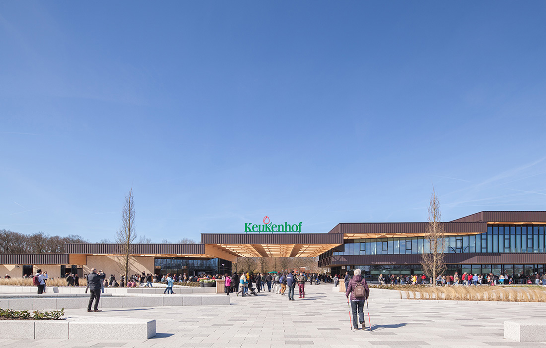 Besökare till Keukenhofs världsberömda trädgårdar möts äntligen av en tydlig entré. Ihopvävda trianglar av limträ skapar ett imponerande tak över två volymer. Likt fem gigantiska trappsteg kliver taket uppåt och skapar dramatik och nivåskillnad. Taket omsluter och klänger sig fast vid och över de två volymerna. Den ena ser ut att bara vara ett plan, men övervåningen döljs av taket och får i stället sitt ljusinsläpp genom lanterniner.