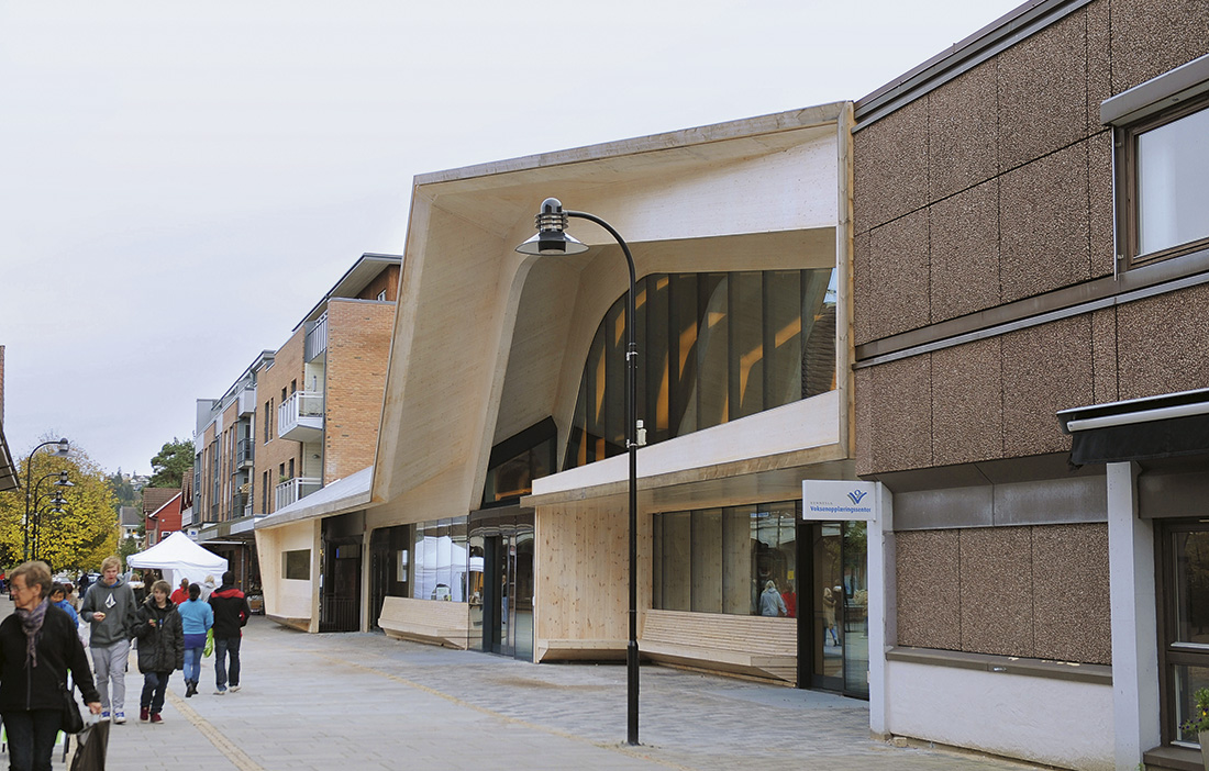 Ett norskt exempel återfinns i Vennesla, där biblioteket som färdigställdes 2011 ryms under en takkonstruktion med ramar av limträ och plywood, medan ytterväggar och bjälklag utförts av KL-trä som lämnats exponerat i interiören (fig 2).