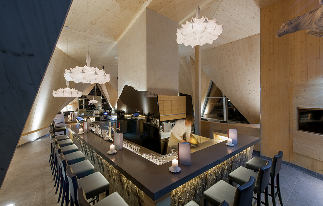 I SPA 3000 Aquadome (2012) i österrikiska Längenfeld används KL-träskivorna för att forma ett vikskal med en facetterad interiör, där träytorna exponeras (fig 5).