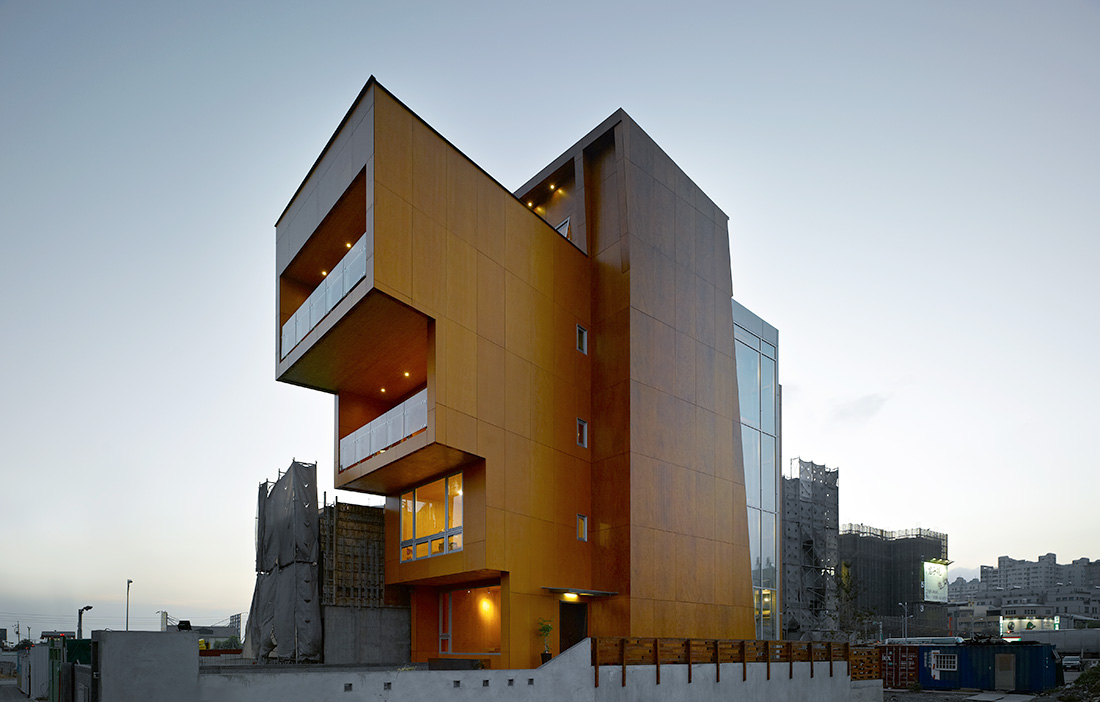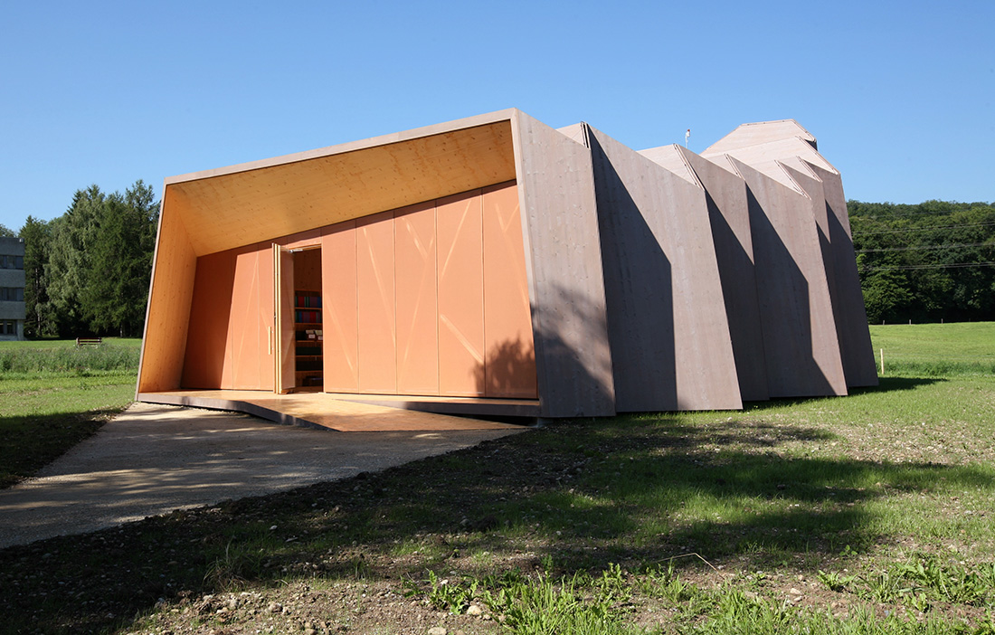 Den fria formen – Korslimmade skivelement kan förtillverkas till en valfri grad av finish. De har en stor fördel i möjligheten att fungera som en hög balk eller som utkragande konsoler, det vill säga de erbjuder styva, robusta byggelement som kan bäras upp av relativt fritt placerade stöd, som exempelvis pelare eller väggar. I fyravåningsbyggnaden Woodtek HQ (2014) i Taichung City, Taiwan, som i sig har en blygsam totalhöjd, utnyttjas KL-träskivor för en stegvis utkragande byggnadskropp (fig 3). KL-träkivor produceras i dag huvudsakligen plana, även om enkelkrökning förekommer, och genom vikta former kan en stor formvariation skapas. Så kallade vikskal – som känns igen inom origamiinspirerade former – har fördelaktiga konstruktionsaspekter och pappersvikningarnas principer kan föras över till korslimmade element som fogas samman med träskruv och/eller bockade stålplåtar i vecken. Ett tidigt exempel på detta var det tillfälliga kapell i schweiziska Saint Loup som uppfördes 2008 (fig 4). Här ses KL-träskivorna rena på insidan, medan exteriören kläddes in för att väderskydda stommen.