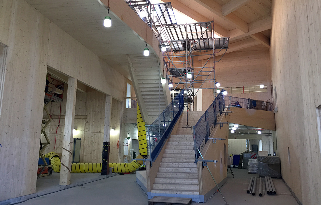 Den höga rationaliteten – KL-träskivorna kan enkelt utföras med håltagningar som fönster, dörröppningar och för ledningsdragningar på fabrik eller på plats. Herrestaskolan i Järfälla norr om Stockholm uppfördes 2015 med KL-trästomme och både håltagningar och trapplopp möjliggjordes genom att utnyttja KL-träets fördelar när det gäller prefab och bearbetbarhet (fig 6). Just möjligheten att effektivt kunna bearbeta skivorna, både i fabrik och på plats gör hanteringen och arbetsgången under byggprocessen mycket lättoptimerad. Skivorna är styva och robusta samtidigt som vikten är låg, vilket gör prefabrikation, logistik, transport och inbyggnad på byggarbetsplatsen smidig med behov endast av lättare kranar för lyft.
