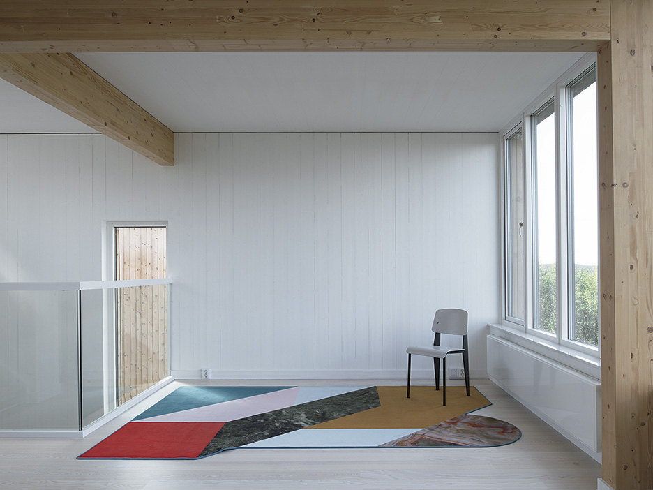 Träet är närvarande överallt. Golv av trä, tak av trä, väggar av trä, fönsterramar av trä, trappor av trä. Till och med yttertaket är klätt med trä.