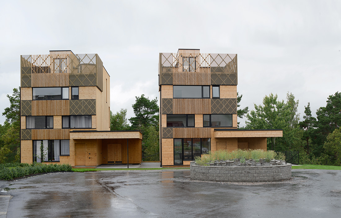 – Gemensam nämnare är att stommen, bjälklag och väggar, är av KL-trä. Fasaden består av hård träullsisolering som putsas och målas vit. Dessutom med solfångare på taken, terrasser, finsnickrade kök och gemensam trädgård, säger Daniel.
