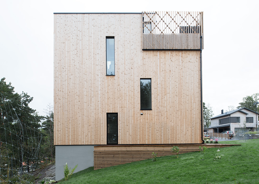 – Ett hus med stomme av korslimmat trä lockade. Och vi är inte besvikna, invändigt är det tyst, ombonat och behagligt och luften är bra för barnen, säger Carl Lidholm.