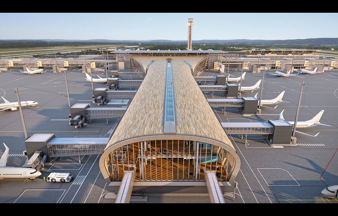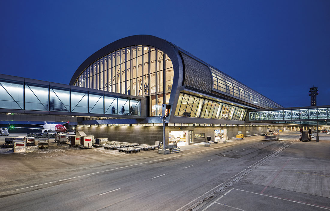 Nordic byggde ut den befintliga terminalen samt moderniserade tågstationen som ligger inuti terminalen. Men den största förändringen var att bygga den 300 meter långa pir som sticker ut mot landningsbanorna. Den smått futuristiska, rundade piren hålls upp av en serie valvbågar av limträ från skandinaviska skogar.