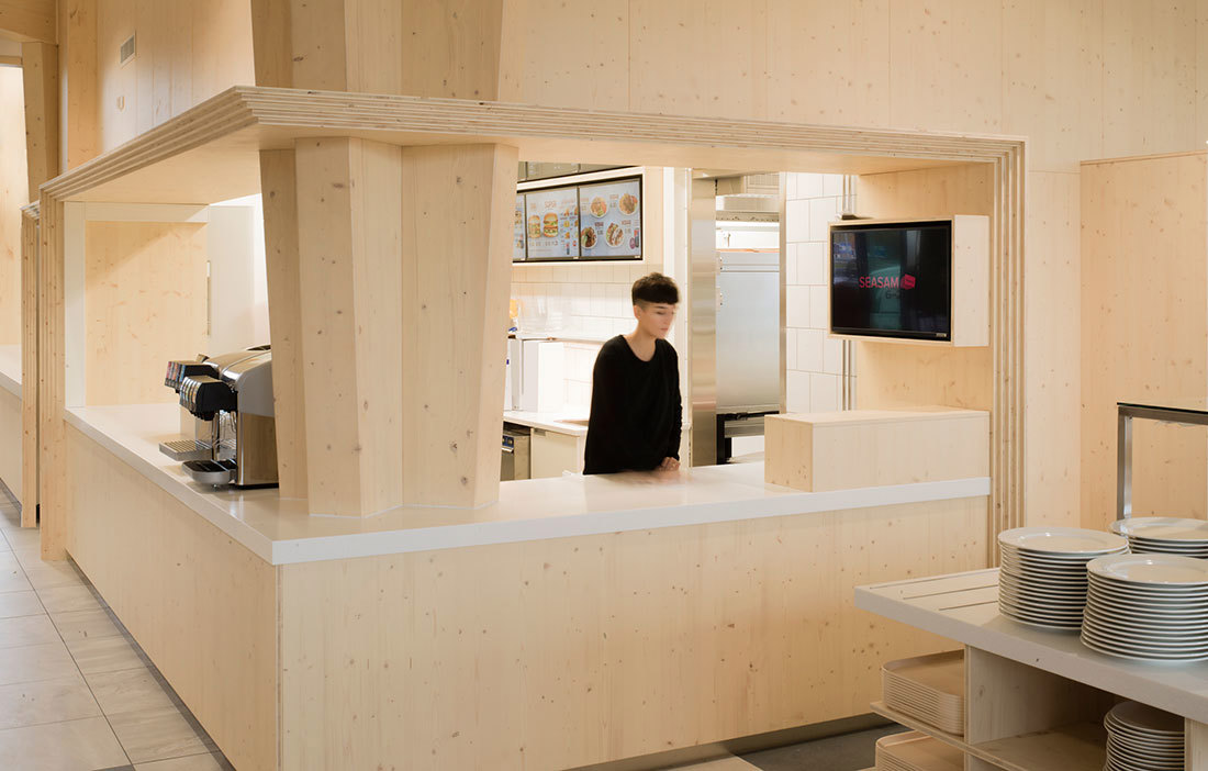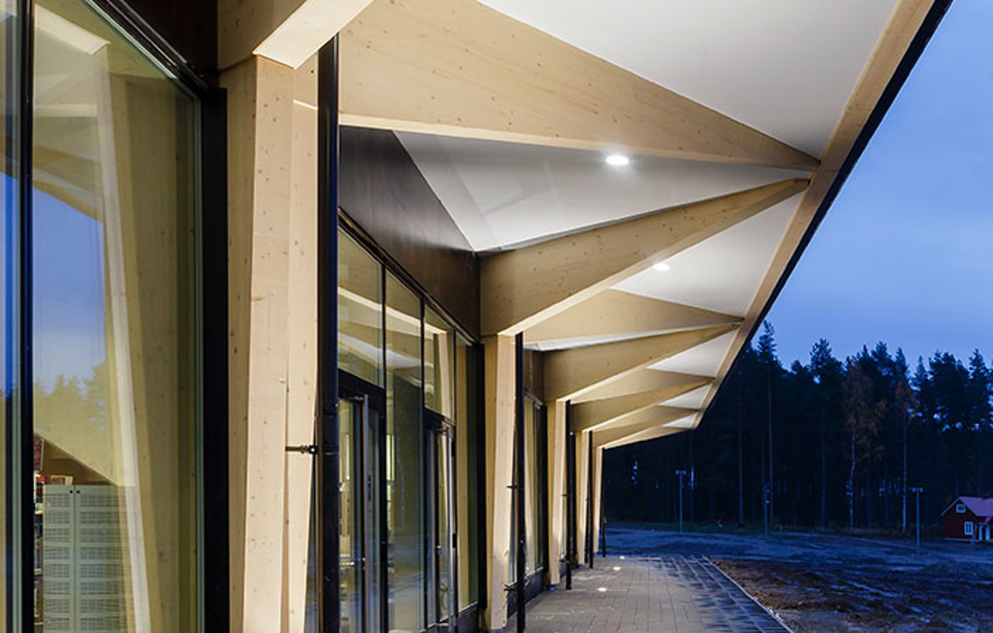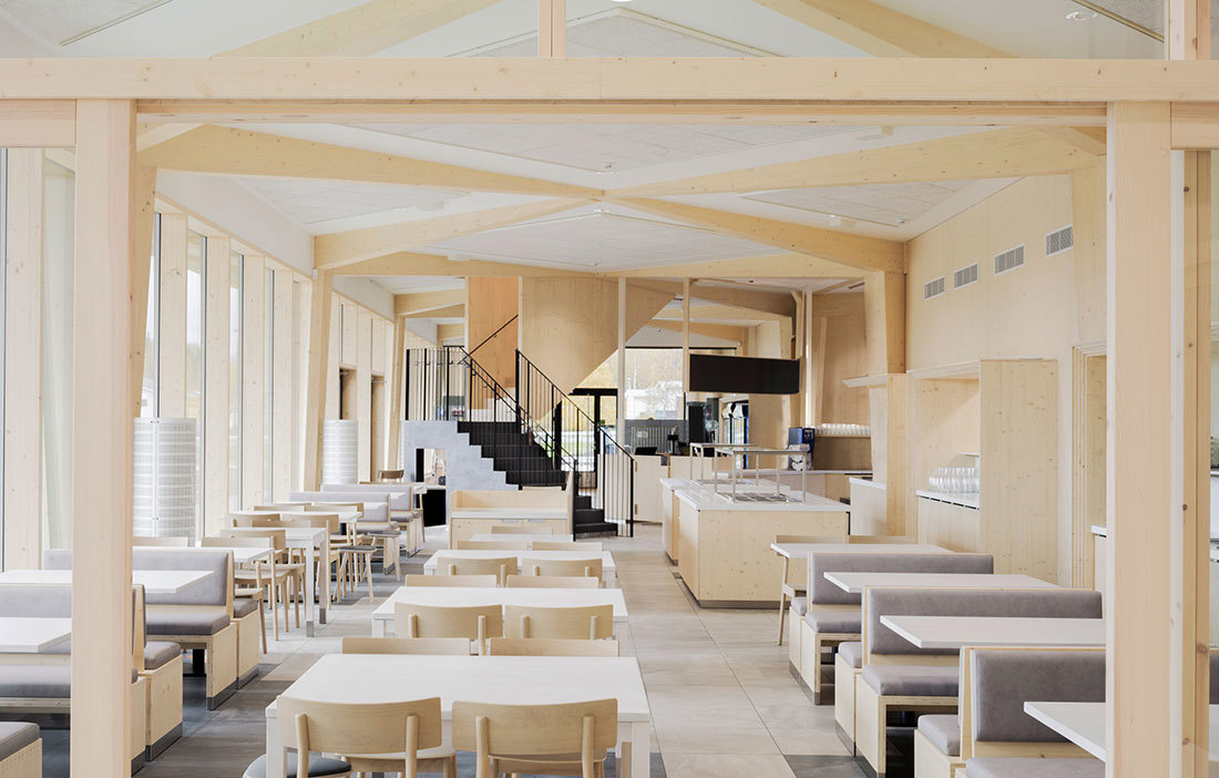 Ett rutnät, 8 x 8 meter och bestående av 24 trädliknande limträpelare, skapar huvudbyggnaden. Pelarna upprepas både exteriört, där de håller upp ett stort svepande tak, och interiört i restaurangen. Ovanpå taket finns en volym som bildar ett litet hotell med tio rum. Interiört är alla väggar konstruerade av kl-trä. Träet har lämnats exponerat så att den natur-liga känslan förhöjs och dessutom för att skapa ett lugn till raststället, något som inte är så vanligt. Exteriört är byggnaden klädd med liggande svartmålade, utvändiga panelbrädor.