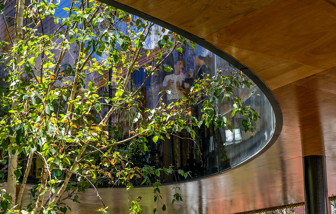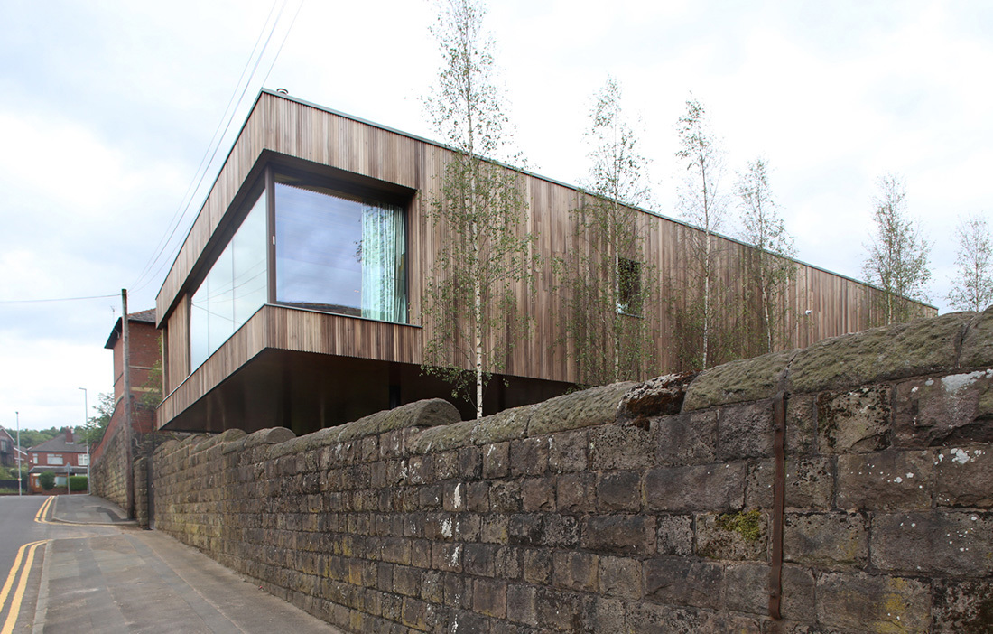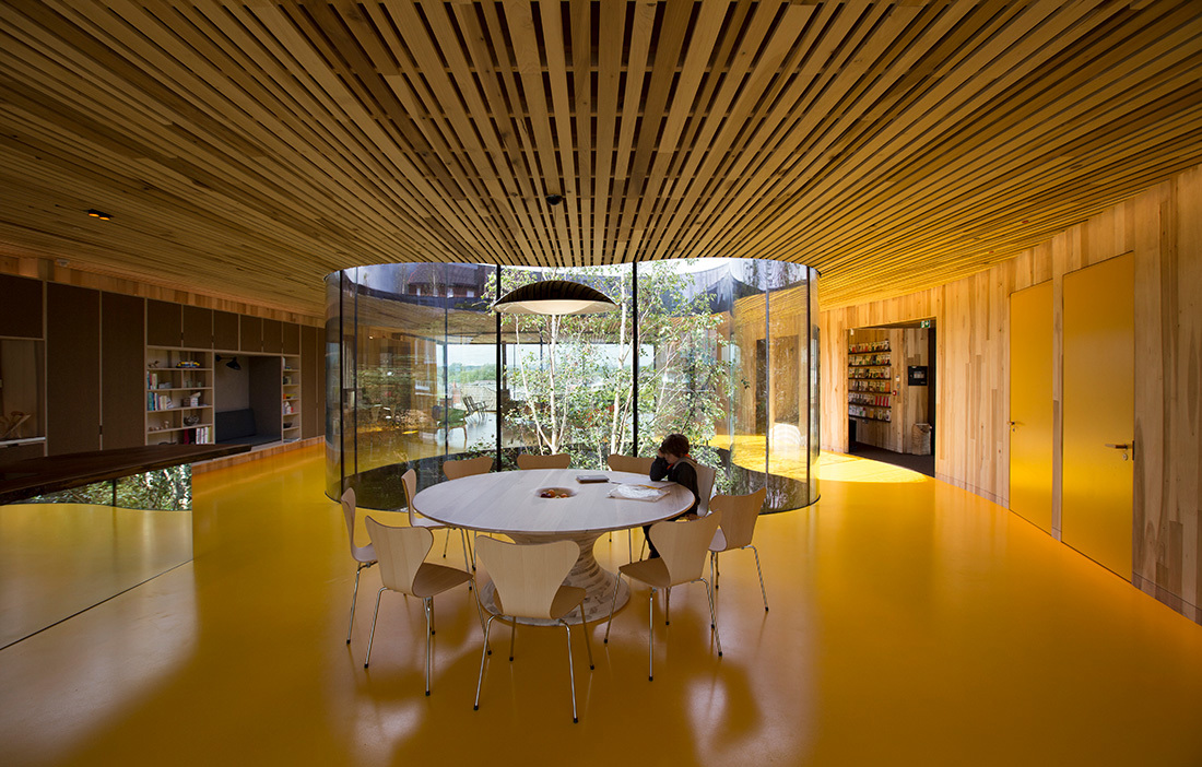 Resultatet är en låg byggnad i ett plan, upphöjd på styltor som skapar en skyddad entré och en skuggig trädgård. Inuti huset ger en stor, oregelbunden, inglasad mjuk öppning mitt i huset karaktär. Hålet låter ett träd växa genom byggnaden, ett träd som både påminner om livet och skapar en naturlig avdelning för husets olika funktioner. Allt trä är av tulpanträ, även fasaden med sin frästa korrugerade profil.