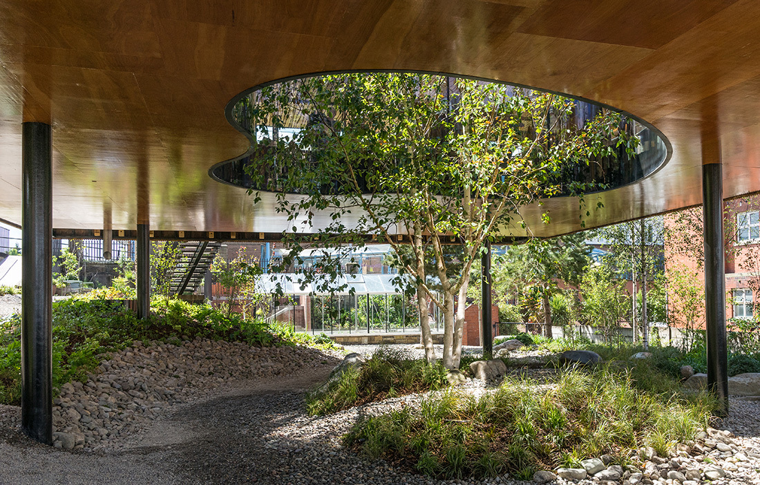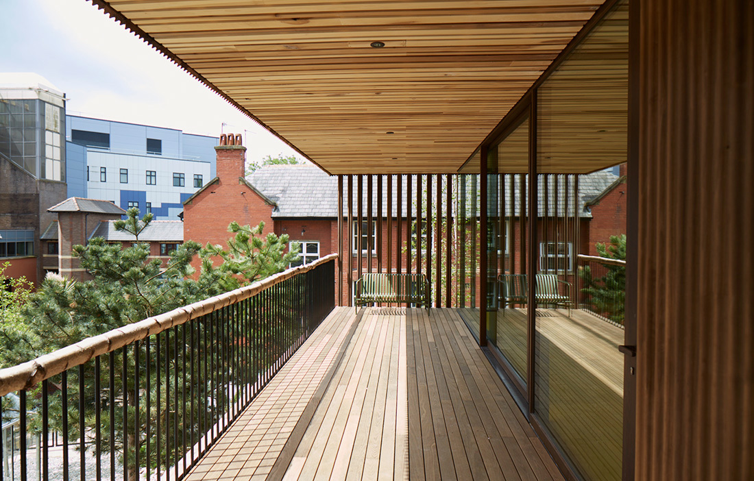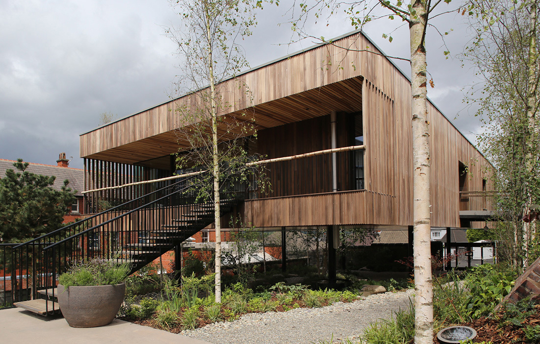 När DRMM med professor Alex de Rijke i spetsen skapade det senaste i raden av Maggie’s Centre i Oldham utanför Manchester var dessa bara några av de frågor som krävde speciell omsorg. Beslutet att använda trä kom delvis från byråns historik med att bygga med KL-trä. Storbritanniens första publika KL-träbyggnad, Kingsdaleskolan i London, ritades av DRMM. Sedan dess har de fortsatt och tillsammans med Arup och Züblin utvecklat KL-trä av lövträ, närmare bestämt tulpanträ. En annan orsak till att bygga med trä är att det inger hopp, humanitet och värme samt träets förmåga att binda koldioxid.