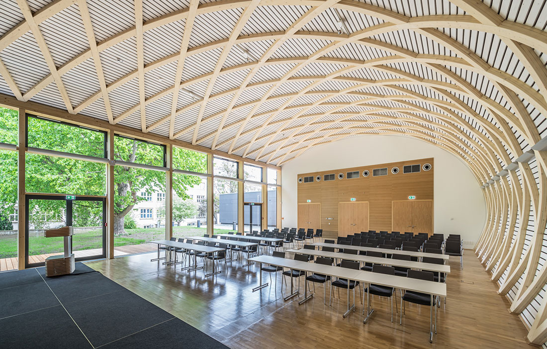 Den tyska privata forskningsorganisationen Institut für Holztechnologie behövde en ny konferenslokal. Självklart byggdes så mycket som möjligt av trä. Mest utmärkande för byggnaden är den stora presentationssalen med plats för 200 personer. Frågan är dock om besökarna kommer att kunna fokusera på presentationerna eller fängslas av den hypnotiskt vackra, välvda skalkonstruktionen?