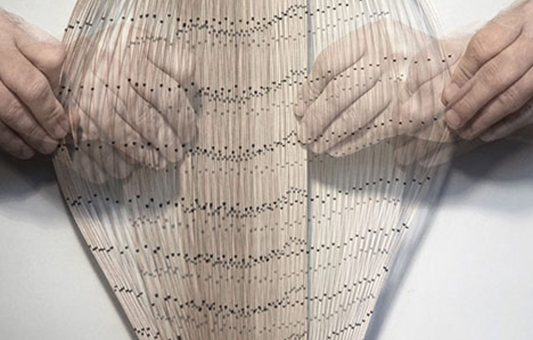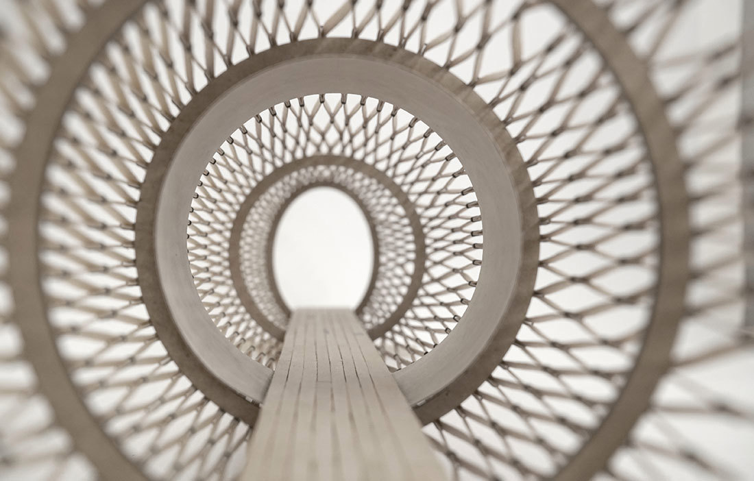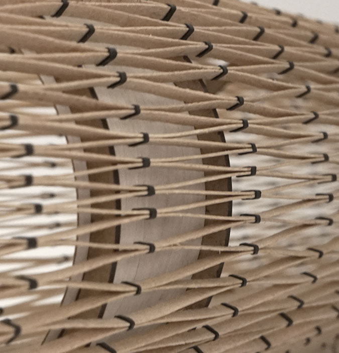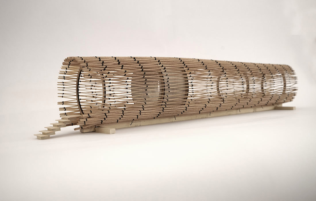konstruerad av hyvlade träribbor 15 x 90 millimeter som växelvis är ihopsatta med slangklämmor. Ribbverket sträcks sedan ut över bågar av limträ och skapar en tunnel. Beroende på slangklämmornas placering och hur hårt ribbverket spänns ut skapas olika effekter. Arkitekterna själva kallar det analog parametrisk design.