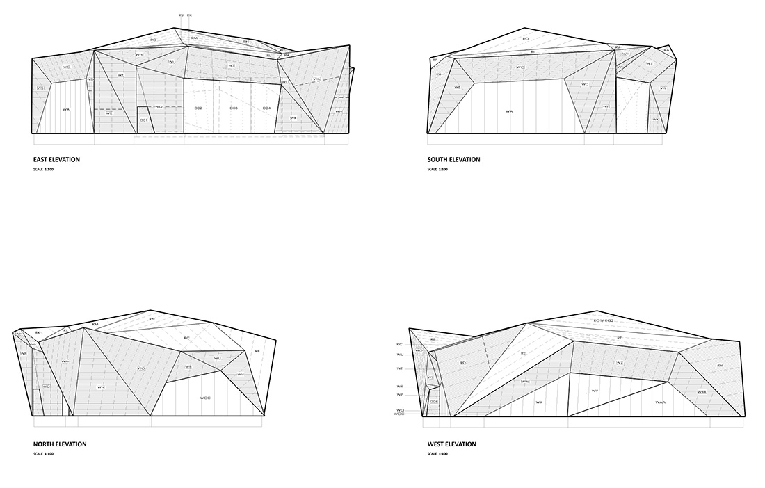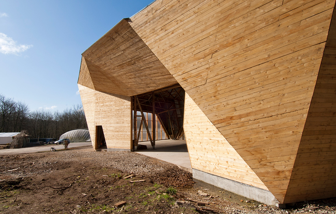 En byggnad som en asymmetrisk ädelsten mitt i skogen. Ett slätt yttre kontrasteras av en synlig konstruktion med bärande stockar. Stockarnas varierade dimensioner fångar genast blicken. Lärk användes för dess beständighet och tillgänglighet.