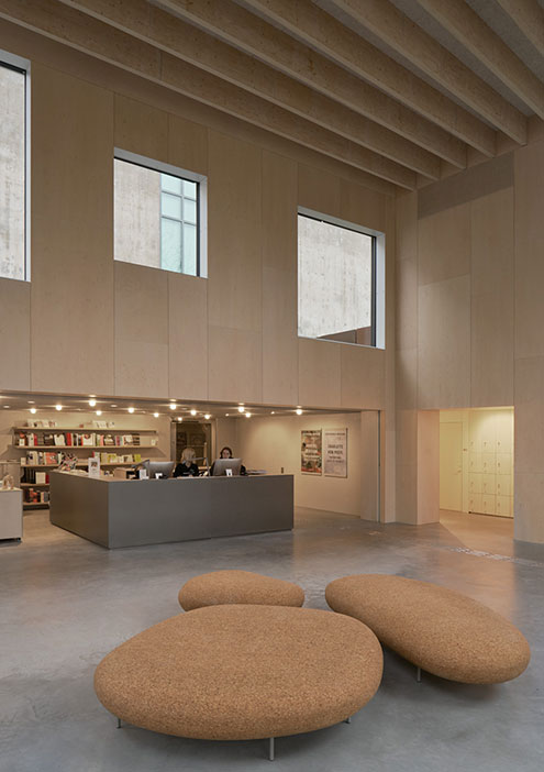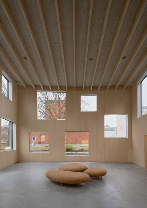 Volymen saknar mellanbjälklag, och träregelstommen i den högre av de två volymerna har fått förstärkningar av stål. Det avskalade takbjälklaget är helt fritt från andra material eller installationer. Dess solfjäderformade fanerträbalkar följer byggnadens krökning och mellan dem ligger ljudabsorberande skivor tillverkade av bland annat träull.