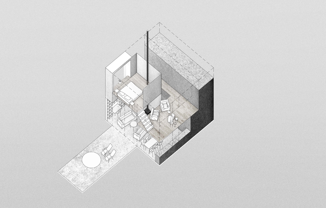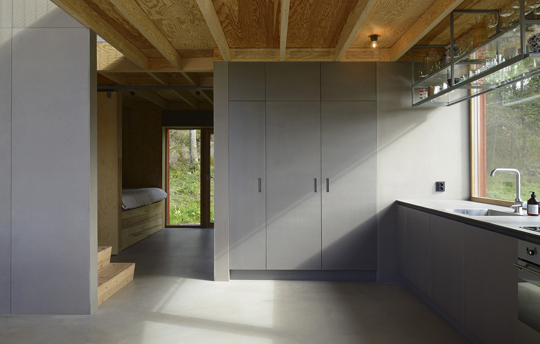 Bortsett från betonggolvet på husets entréplan är interiören helt utformad av två trämaterial, plywood och den mörkgrå träfiberskivan Valchromat. På så vis används bara två färgtoner i huset, och syftet med det är att i stället lyfta fram rumsmöjligheter.