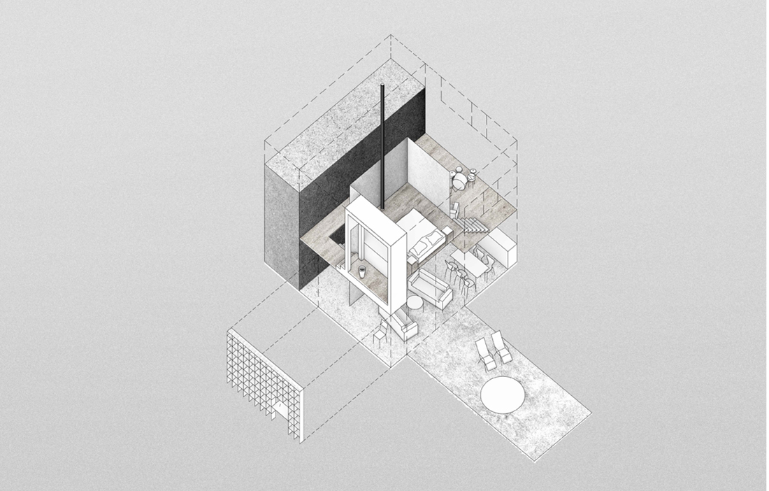 Entréplanet består av ett gjutet betonggolv, som fortsätter på utsidan av huset i form av så kallade betongbryggor. Övriga plan är förskjutna i vertikalled och har därför varierande höjder och format. På så vis skapas ett flöde, inte bara i plan, utan även genom husets sektion.