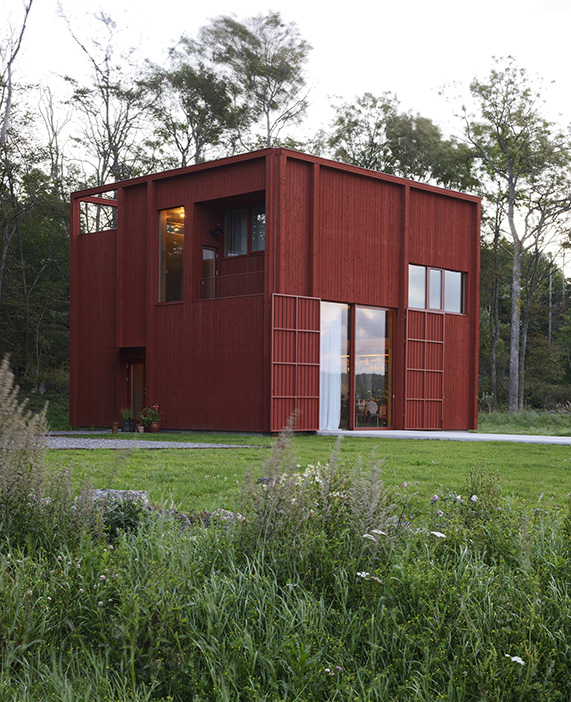 – En detalj som utmärker huset är det 3,5 meter höga glaspartiet i vardagsrummet som släpper in åkerlandskapet utanför. Glaspartiet kan tillslutas med glesa magasinportar och när de är stängda silas solljuset in genom springorna. Det här ger en liknande känsla av att vara i en gammal lada, där solljuset tränger igenom sprickorna i den stängda ladugårdsporten. Genom den här typen av lösningar finns det omgivande landskapet alltid närvarande i huset, säger Andreas.