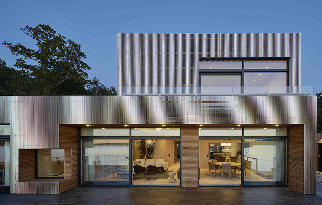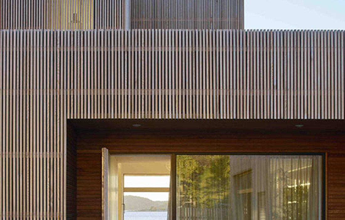 De är uppsågade från bredare cederplank och därefter handspikade läkt för läkt. Tack vare det har man haft större frihet att bestämma virkets dimensioner och även kunnat ta tillvara på spillvirket. Några fönster har försetts med luckor som skjuts bakom rastret när de inte används. Eftersom luckorna består av horisontel läkt skapas då en moaréeffekt i fasaden. Större delen av panelen är obehandlad och får gråna i sin egen takt. Sittnischer och indragningar har i stället oljats för att behålla sin röda ton.