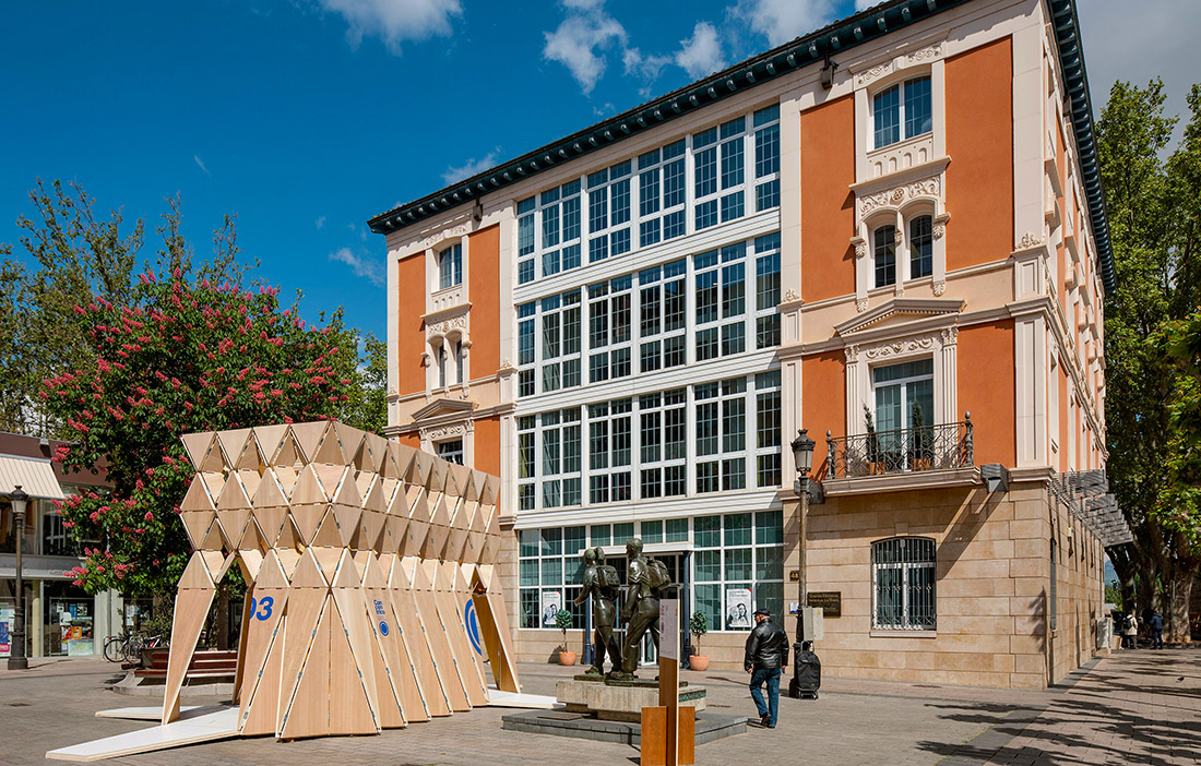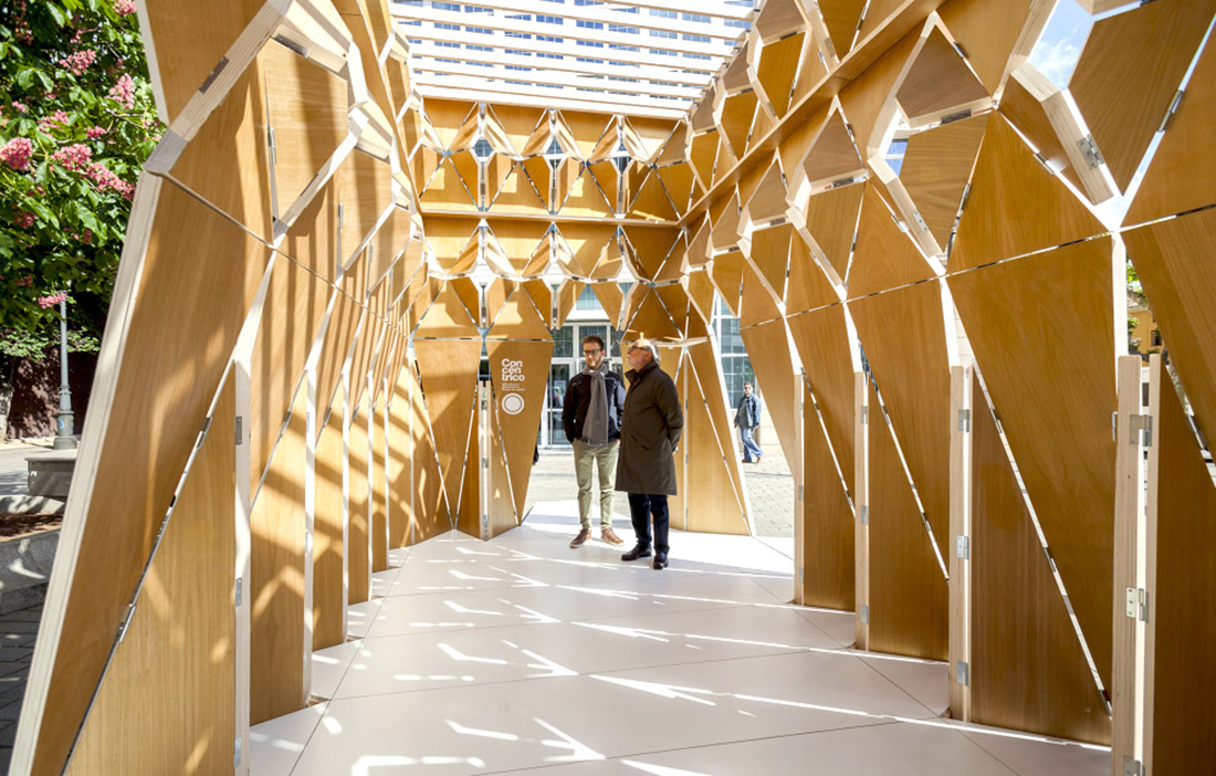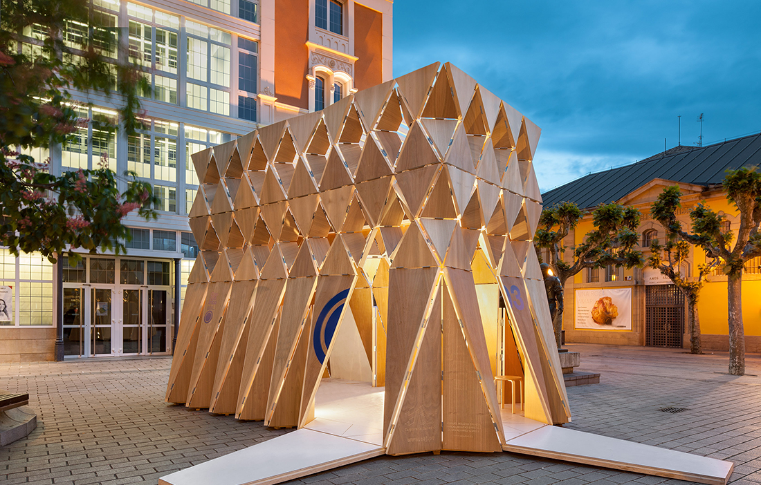 Ett ensamt papper kan inte på egen hand stå rakt upp, men genom att vika det i olika vinklar och formationer blir det inte bara stabilare utan också tillräckligt starkt för att bära större krafter än sin egen vikt. Samma princip fungerar när man sätter samman flera skivor av trä. Så resonerade arkitekterna Manuel Bouzas Cavada, Manuel Bouzas Barcala och Clara Álvarez när de skapade en paviljong till arkitektur- och designfestivalen Concéntrico 03, där samtliga installationer konstruerades med plywood.