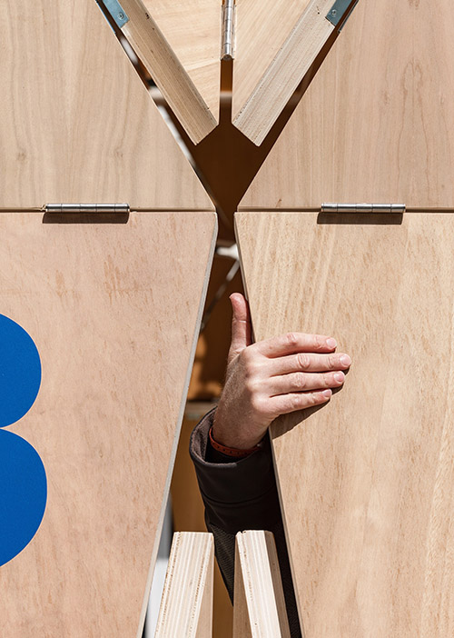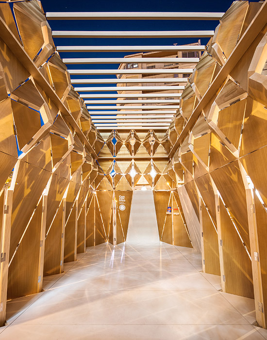 Inspirerade av japansk origami var syftet att väcka besökarnas nyfikenhet och visa att plywood är tillräckligt starkt för att vara självbärande. Paviljongen saknar bärande regelstomme, i stället bärs konstruktionen upp enbart av de 39 plywoodskivorna som sammanfogats och lutats mot varandra så att tyngdlagen därefter ska ta vid. För att kunna vika och vinkla skivorna på samma sätt som pappersföregångaren är de försedda med gångjärn i skarvarna. Konstruktionen låter också ljus flöda in och bilda ett spännande mönster.