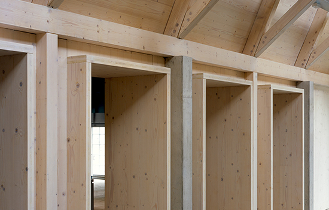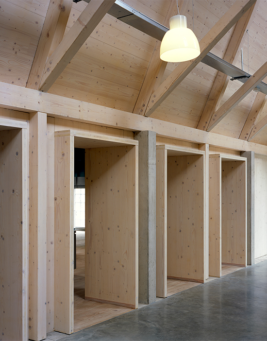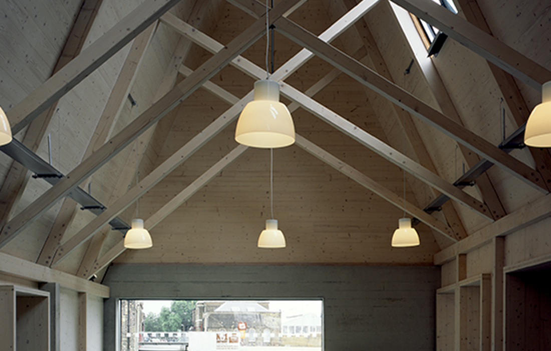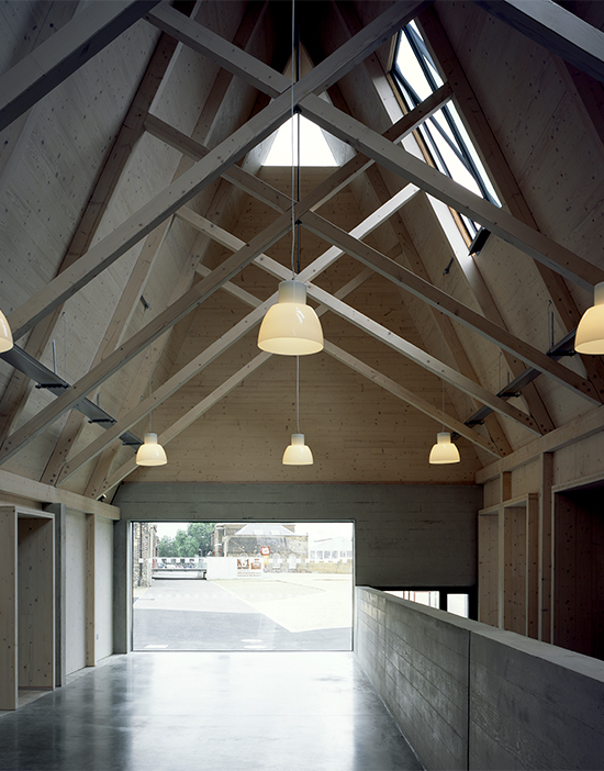 Ljuset som faller på entrébyggnadens spirande mönster av saxtakstolar skapar ett förhöjt anslag i dialog med traditionell byggnadskonst. Den varierade användningen av trä, som modern panel, ornamenterande betonggjutform, laminerad skiva eller konstruktionsvirke, både påvisar och överbrygger tidsgapet till historien.