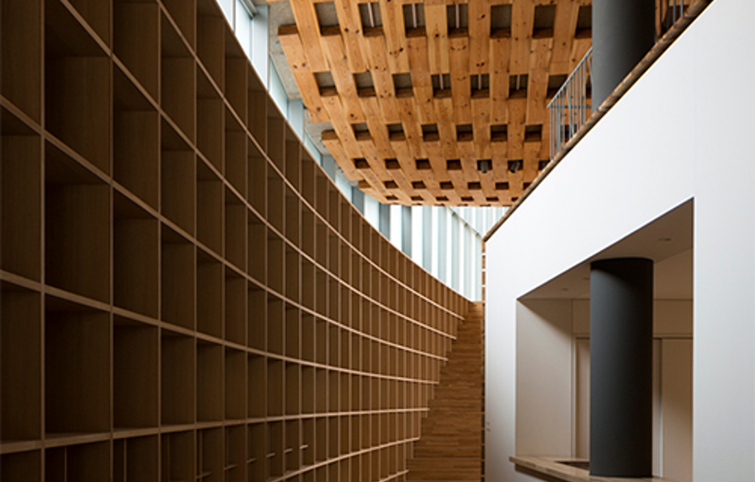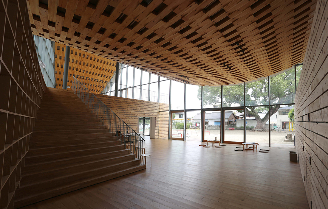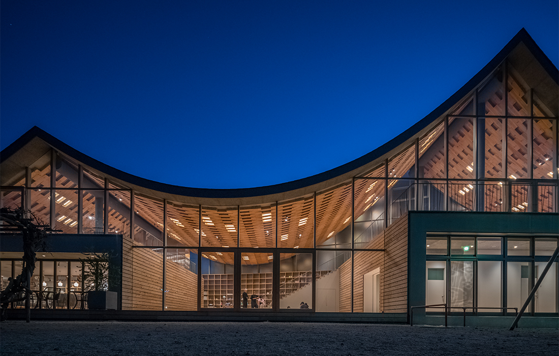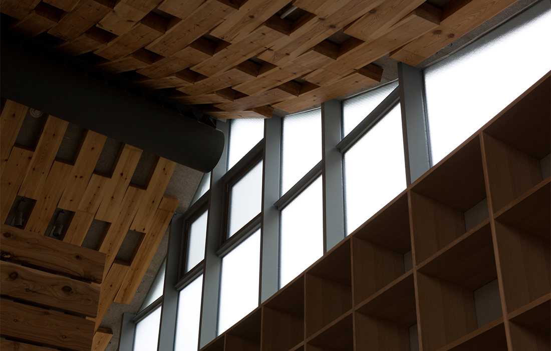 Utvändigt ger byggnadens distinkta siluett med sina två toppar en modern inramning till området, och den geometriska formen antyder också att det är en byggnad för naturvetenskap. Men trots att den glasade långsidan ger en försmak av inredningen är det framför allt när besökaren träder in i byggnaden som det mjukt böljande innertaket visar sig i sin fulla prakt med en tydlig referens till ortens många tempel och dess kultur. Hängtakets annorlunda men sinnrika konstruktion med korta bjälkar av japansk rödtall som binds samman med genomgående stål-stag, bildar en naturlig kedjelinje som endast tar upp dragkrafter och vars smäckra form sträcker sig längs hela byggnaden.