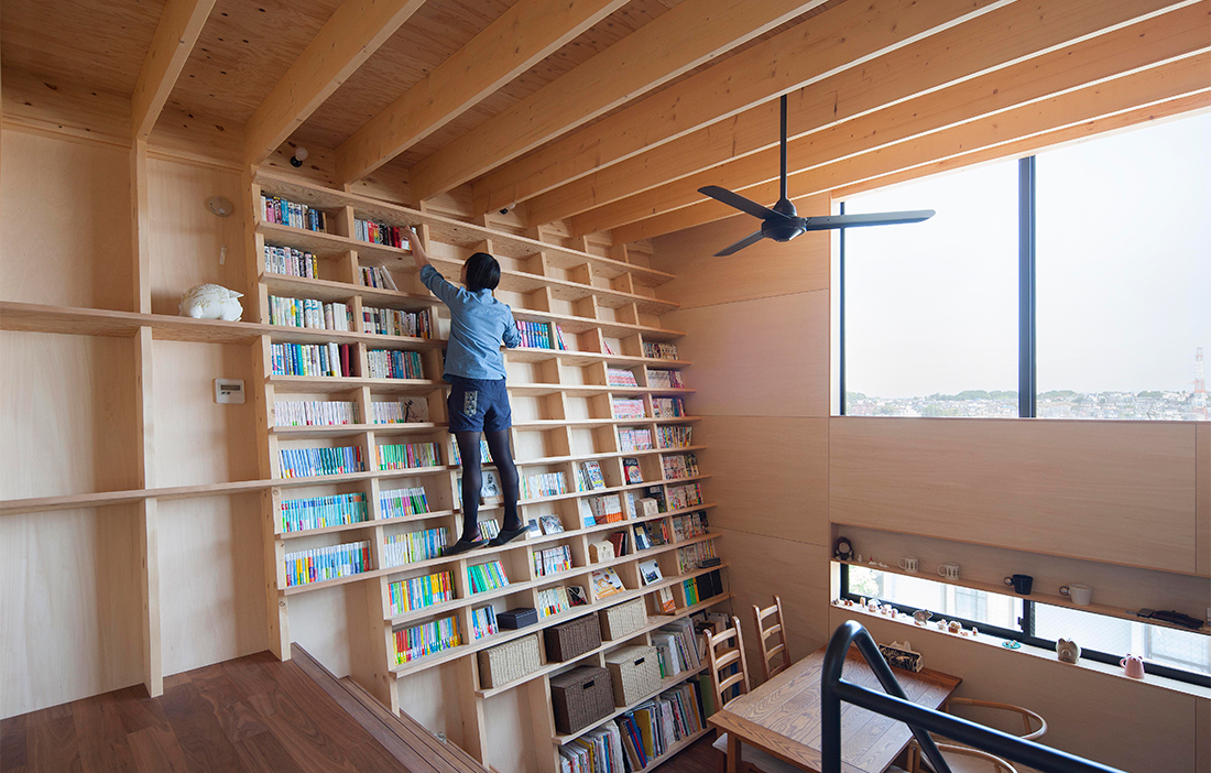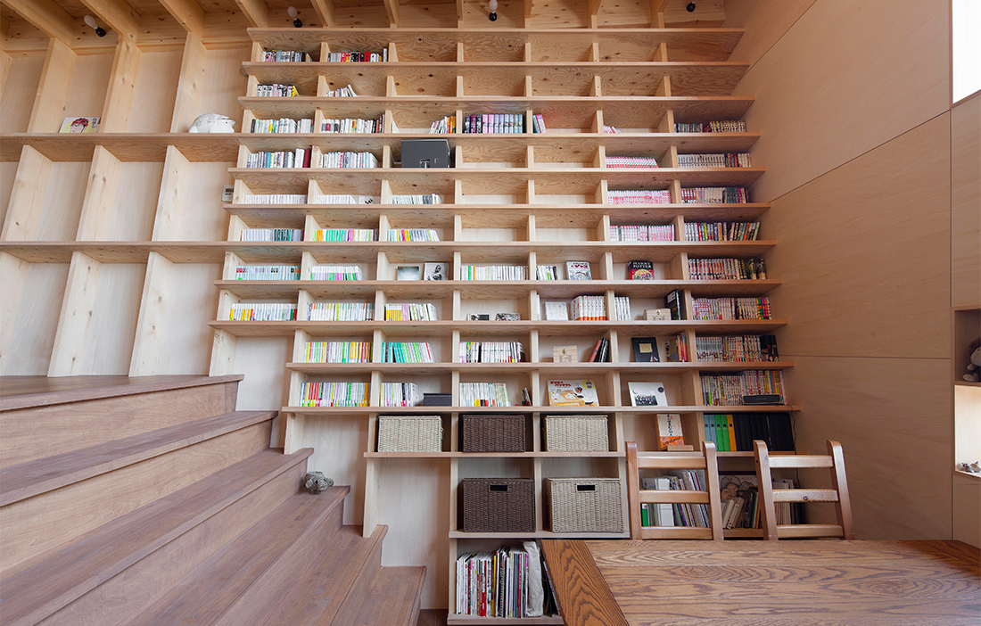 Det sägs att ett hem utan böcker är som en kropp utan själ. I Yokahama har Shinsuke Fujii Architects tagit ordspråket ett steg längre genom att i en privatbostad integrera bokhyllans kropp med böckernas själ. I »The bookshelf house« består ena väggen av en bokhylla som löper från golv till tak och över två våningar. Bokhyllan är integrerad i väggen och utformad av de upp till fyra meter höga bärande väggreglarna, mellan dessa är vertikala hyllplan med motsvarande lutning uppsatta. Tack vare lutningen ska såväl barn som äldre lätt kunna använda hyllorna som trappsteg för att nå den bok de önskar utan att behöva stege.