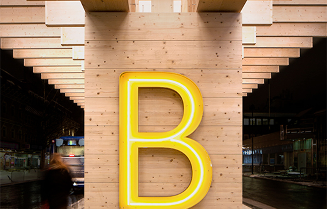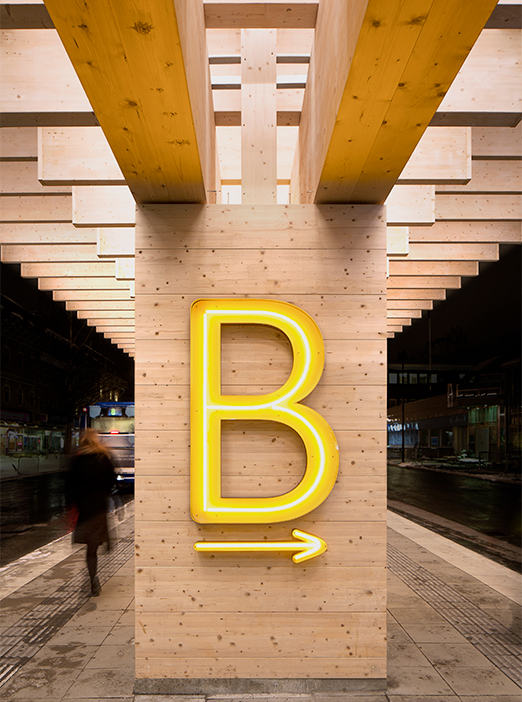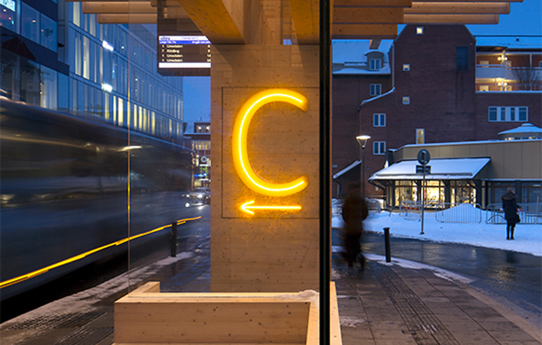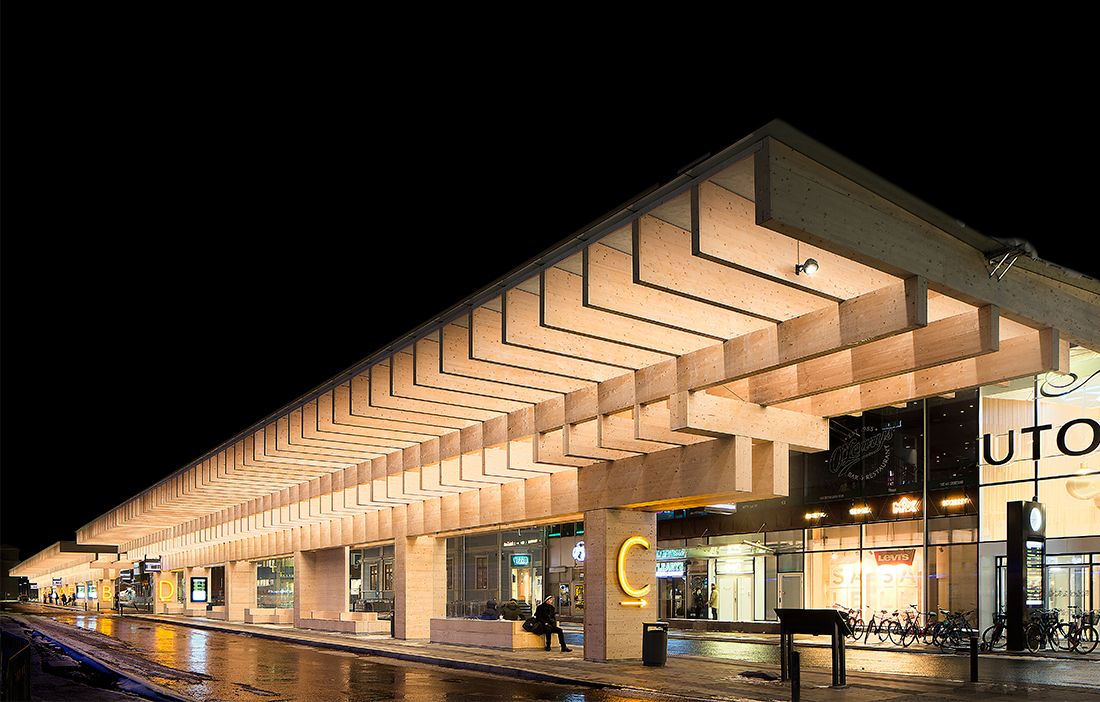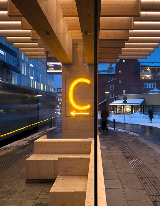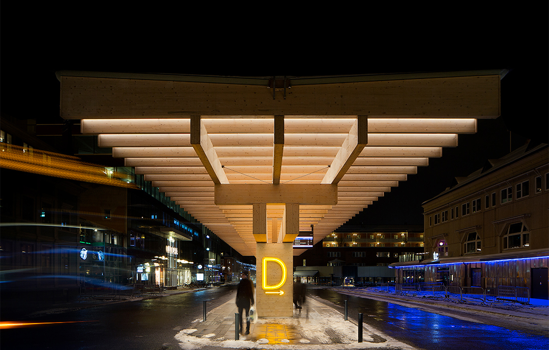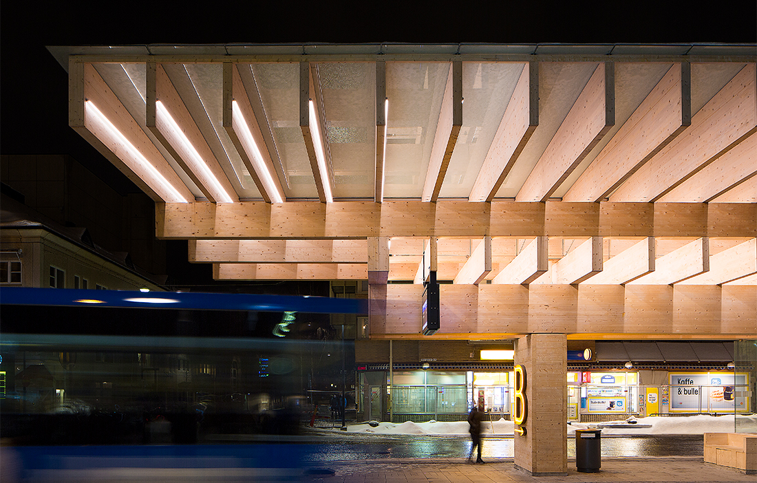Vasaplan i Umeå är inte längre bara en knutpunkt för busstrafik och en plats att passera för den som är på väg. Med sin nya utformning och kostym av limträ har platsen också blivit ett ställe där människor kan mötas. Mittperrongen, inramad av två skärmtak, har en tydlig trädstruktur, där bärverket av limträbalkar bildar ett raster. Under soliga dagar kommer lamellerna att ge liv till platsen med ett föränderligt skuggspel. Men glastaket som vilar på limträbalkarna kommer också att fungera som skydd för nederbörd.