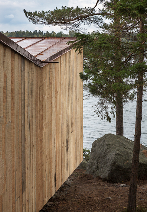Från början var det en paviljong av douglasgran som konstruerades till Wallpaper Handmade i Milano. Därefter ställdes den ut på biennalen i Venedig och skickades sedan vidare till hantverksutställningen Zumthor Bregenzerwald. Men nu är det slutrest för paviljongen som i stället har förvandlats till ett 25 kvadratmeter stort attefallshus och slagit rot på Lindholmen söder om Stockholm. Där vilar det på åtta konformade betongplintar, och med sin flexibla inredning tjänstgör det både som kajakhus och en avskild plats för familjens tonåringar.