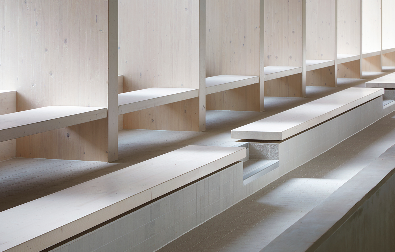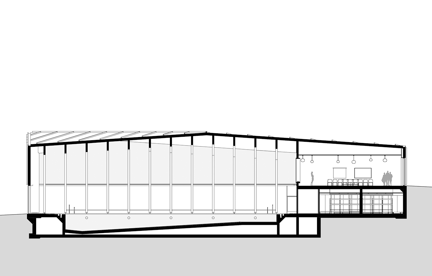 – Ena halvan är egentligen bara en spegelbild av den andra, vilket underlättade produktionen av limträramarna. Att lyfta upp och sänka ner simhallens hörn hade dessutom en praktisk funktion. Taket sänker sig något där omgivningen sänker sig för att smälta in. Där byggnaden reser sig har vi på ena sidan placerat entrén och på den andra sidan stora fönster som vetter mot skogen.