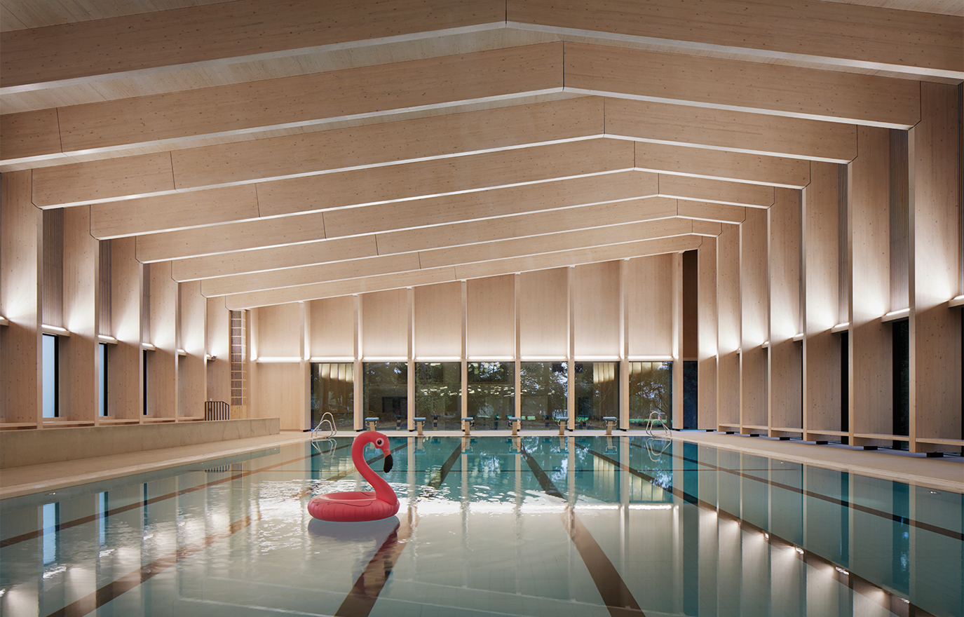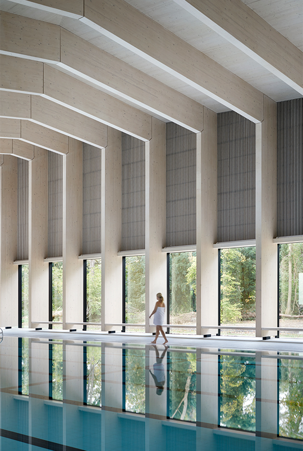 – Den omkringliggande naturen blev en stor inspirationskälla till simhallen. Vi visste redan att vi ville bygga med trä, men det blev nu ännu mer naturligt. Skogen skulle reflekteras även interiört, så vi skapade en synlig limträkonstruktion. Man ser rätt ut i skogen genom de stora fönsterpartierna men det är även trä på väggar och i taket. Det ger en känsla av att simma bland träden.