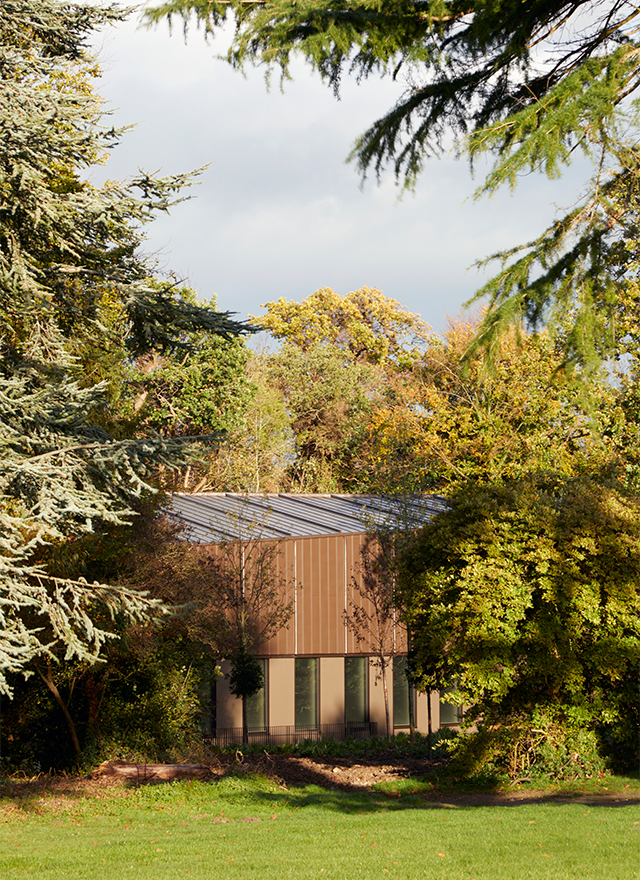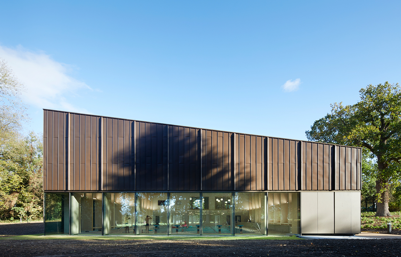 Simhallen flyttades från västra delen av skolområdet till den östra, intill övriga sportanläggningar som rugby- och cricketfält, fotbollsplan och tennishallar. Alldeles i närheten låg även något annat som fångade arkitekternas uppmärksamhet – en gammal vacker ekskog. De började drömma om att få bygga här, inne i skogen. Men det innebar stora utmaningar, inte minst att få tillstånd att använda marken. Landskapet är, precis som skolans slottsliknande huvudbyggnad och andra delar av omgivningen, listat som kulturhistoriskt värdefullt område. Efter långa förhandlingar fick arkitekterna till slut lov att bygga här. En förutsättning var dock att de skapade en vacker byggnad som fungerade väl tillsammans med övrig byggnation, och att den inte förtog, utan snarare framhävde, det gamla skogsområdet.