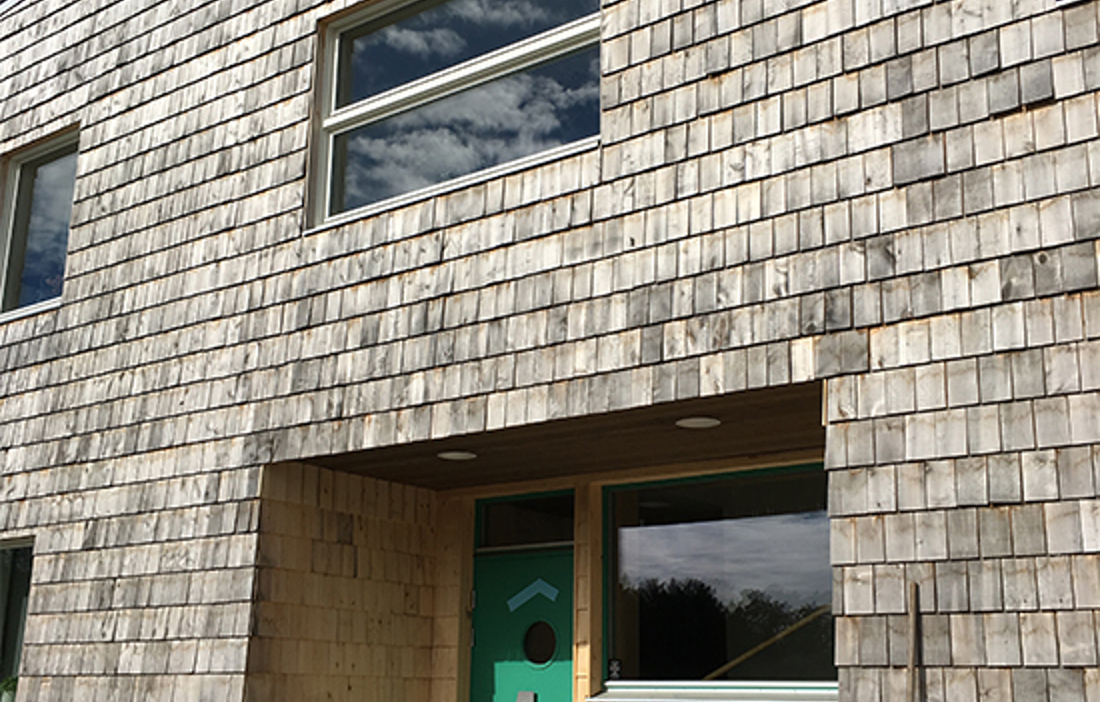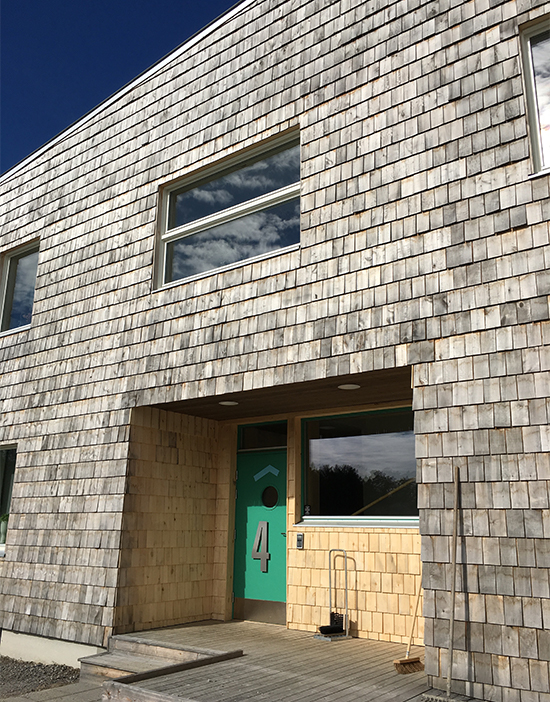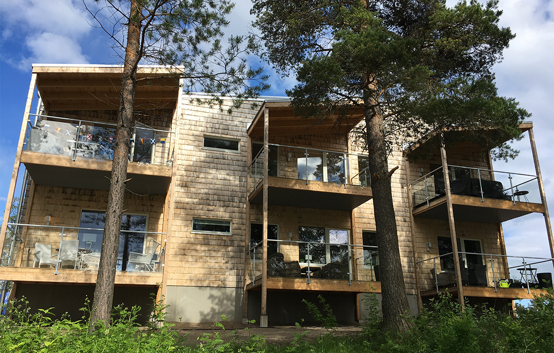 Fasaderna är klädda med aspspån från lokalt avverkade aspar och sågade i närliggande byn Glommers- träsk. Spånen ska inte ytbehandlas utan får gråna naturligt. Block Arkitekter bedömer deras livslängd till minst 40 år – och husen har kapacitet att stå i flera hundra år.