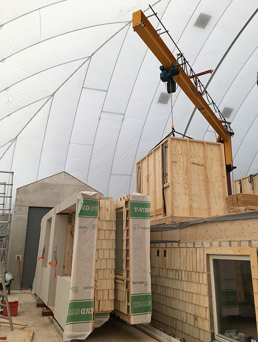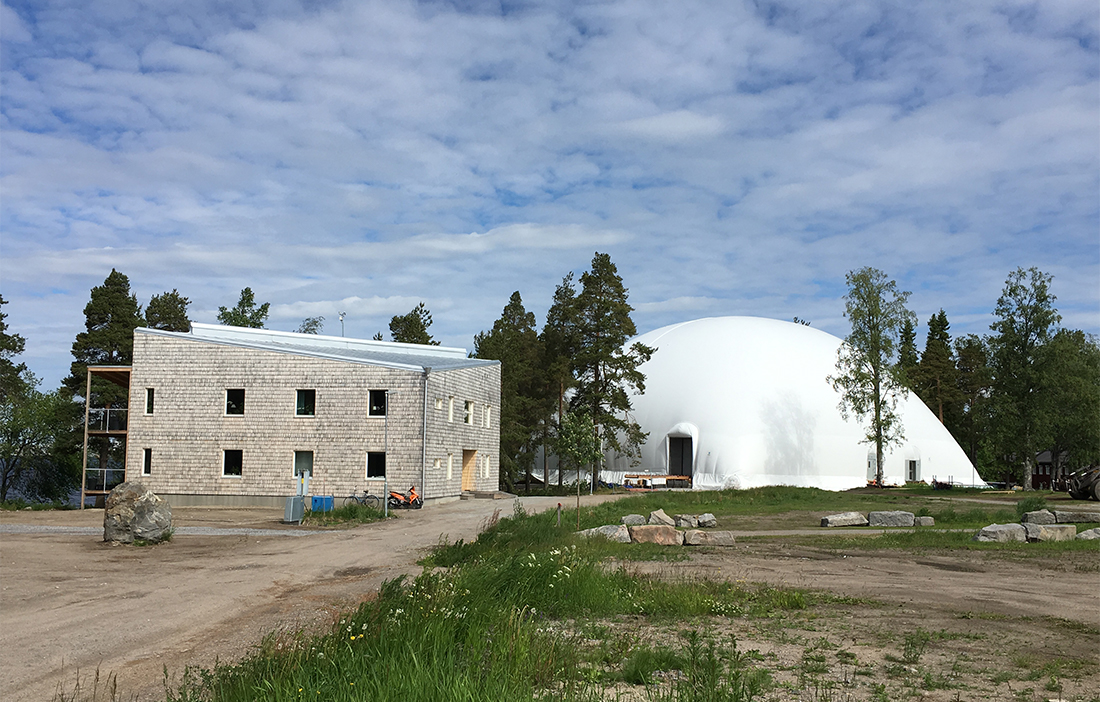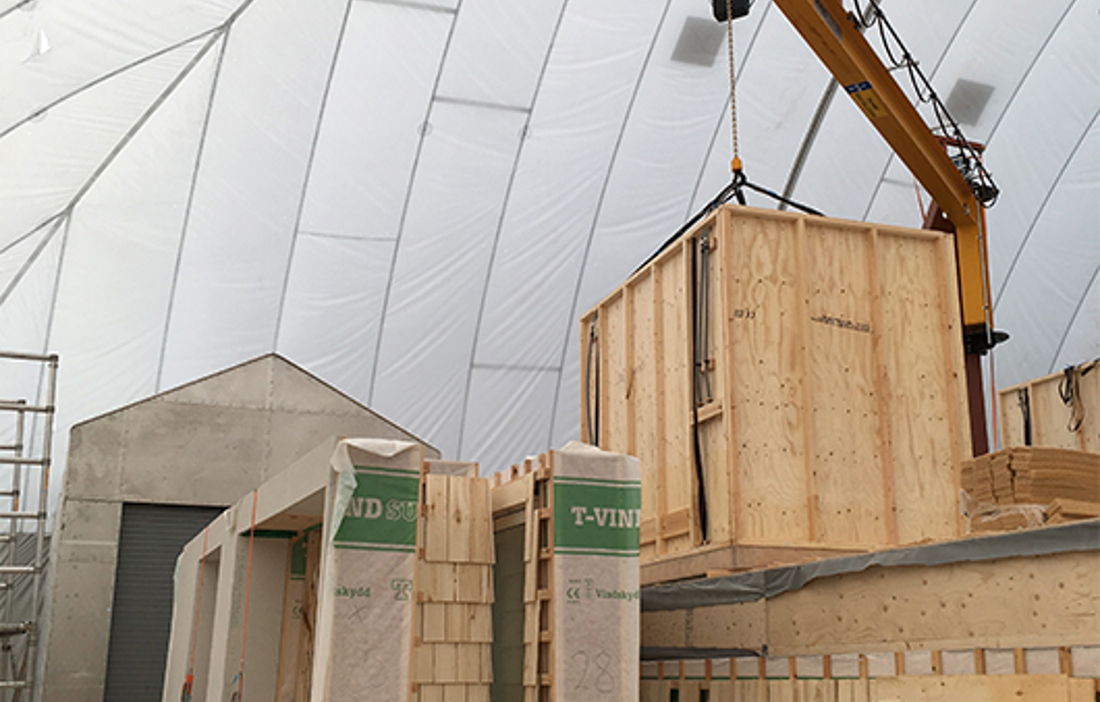 Likt ett halvklot tornade det stora byggnadstältet upp sig i Piteå när det ekologiska kvarteret Lusthusbacken byggdes. Det utvecklades av entreprenören Grönbo i samband med bygget och resultatet blev en stor tidsbesparing och en bättre arbetsmiljö. Inne i det uppblåsbara tältet gick det att bygga samtliga fyra våningar av husen, och därmed kunde hela byggprocessen ske helt väderskyddad. De olika elementen prefabricerades i närliggande fabriker och monterades därefter i skydd av tältet.
