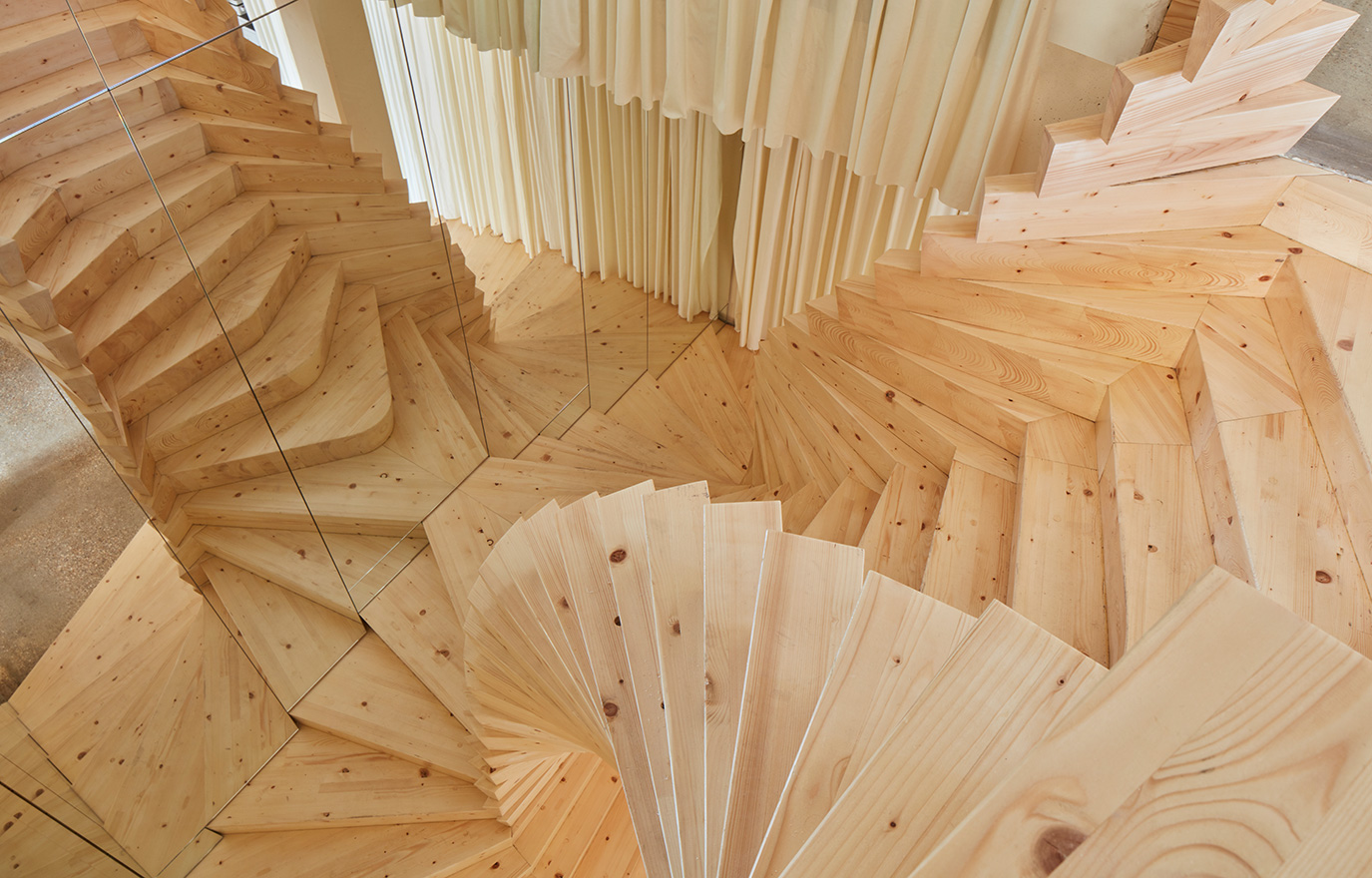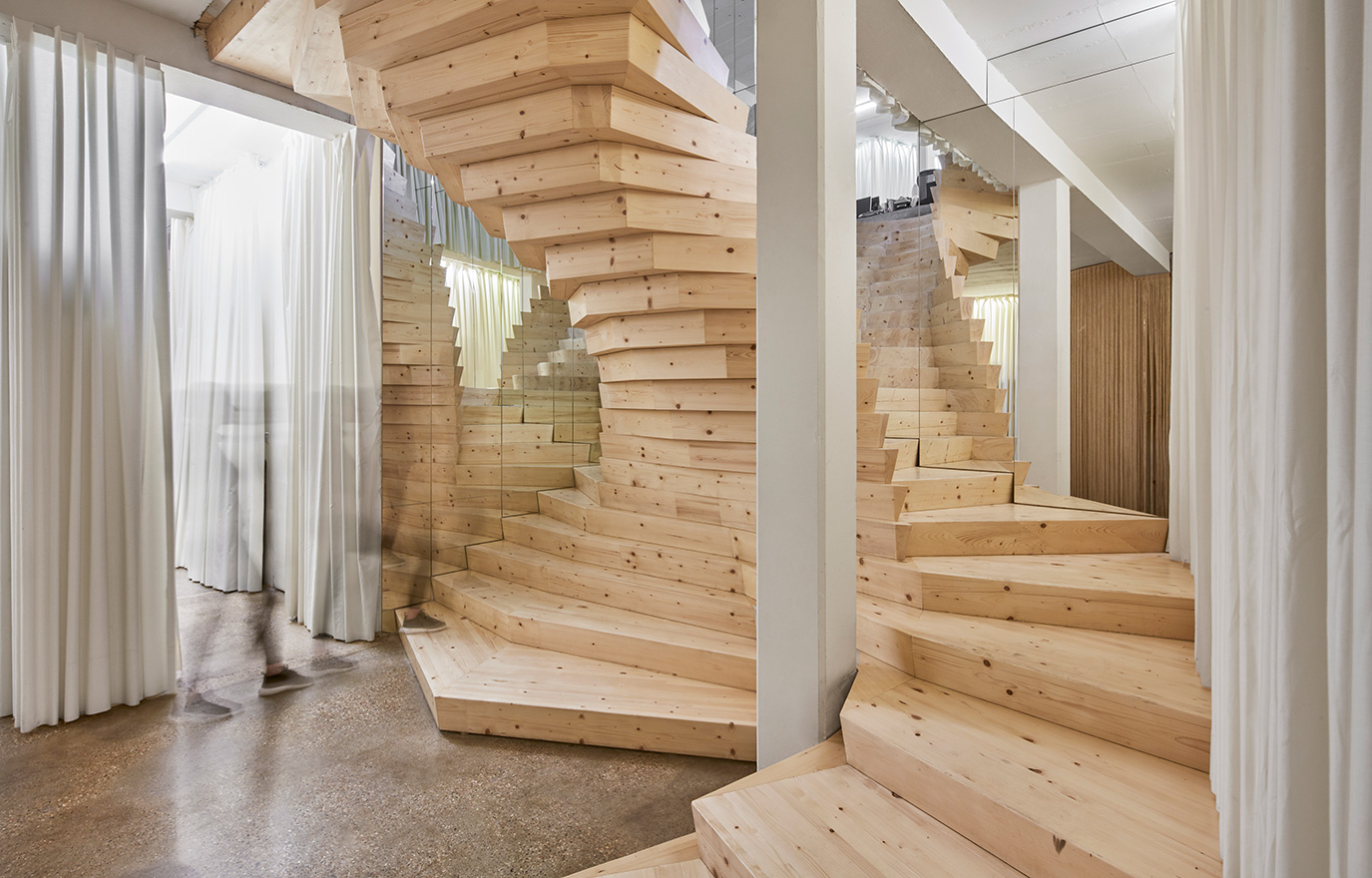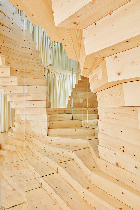 Det sägs att designern Coco Chanel betraktade sina modevisningar ovanifrån. Från den övre delen av modehusets trappa hade hon, tack vare dess speglar, utsikt över visningens alla vinklar. Det har inspirerat arkitektkontoret Acme att med hjälp av modern träteknik skapa en minst lika imponerande trappa, på två sidor klädd med speglar som ger den ett både kraftfullt och lekfullt uttryck.
