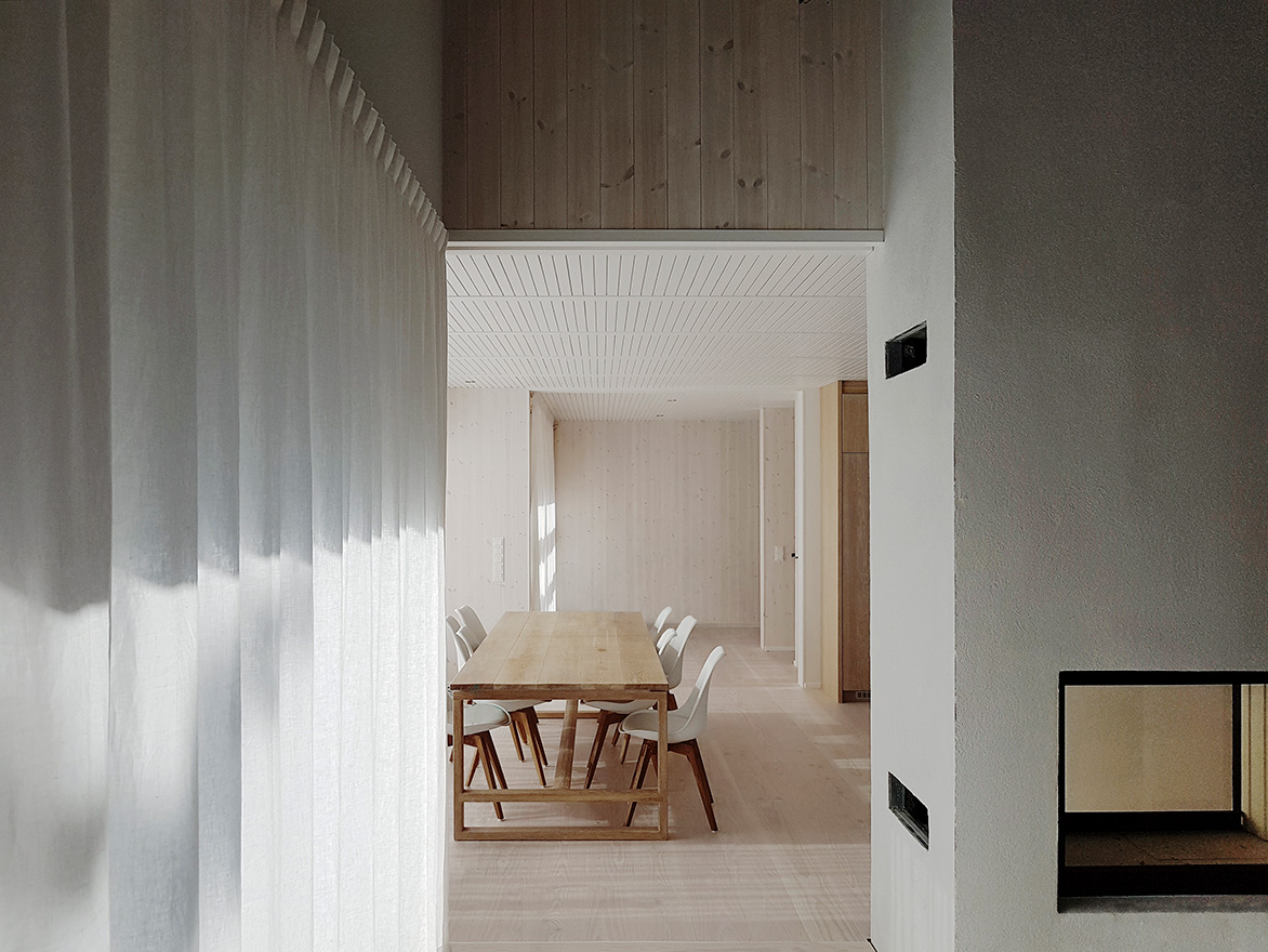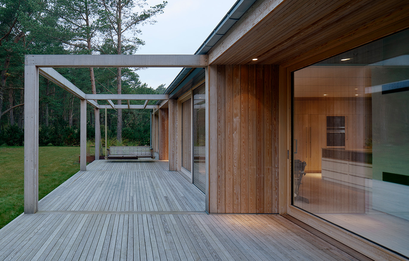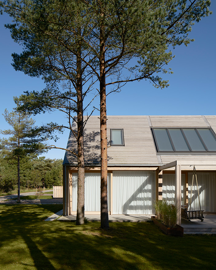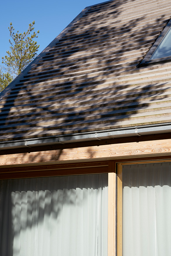 Fasaderna är klädda med en stående panel med specialritad profil, och det kraftigt lutande sadeltaket är klätt med en förvandringspanel. Precis som trädäcket och pergolan är de av sibirisk lärk som har behandlats med kiselbaserat träskydd. Samtliga rum på övervåningen är försedda med takfönster. Nedervåningens generösa fönster ger ett kraftigt ljusinsläpp och tack vare skjutdörrar finns även möjlighet att helt öppna rummen mot det tillhörande trädäcket och trädgården.