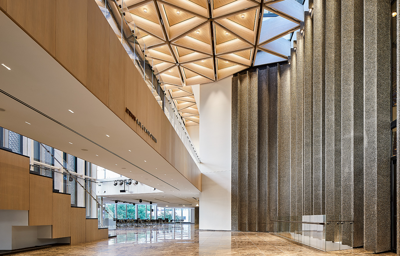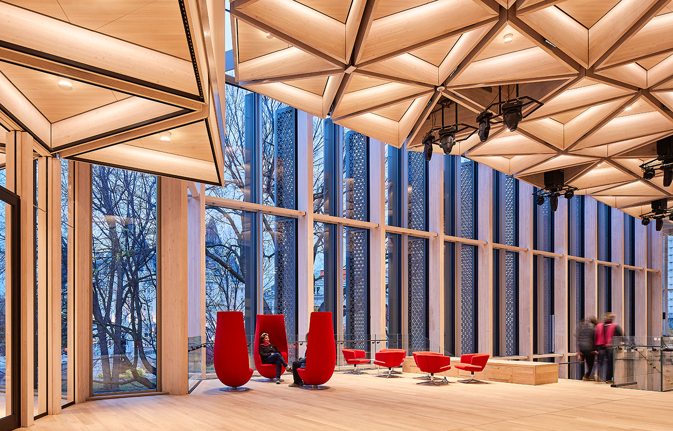 Den nya, prefabricerade konstruktionen består av obehandlad Douglasgran, vilken exponeras tydligt i såväl stomme som innertakskassetterna. Detta kombineras med frikostiga glaspartier, vilka både ger ett stort och behagligt ljusinsläpp och låter nyfikna förbipasserande ta del av den nya arkitekturen. Tillbyggnaden, ritad av Diamond Schmitt Architects, vann i fjol nordamerikanska Wood Design Awards.