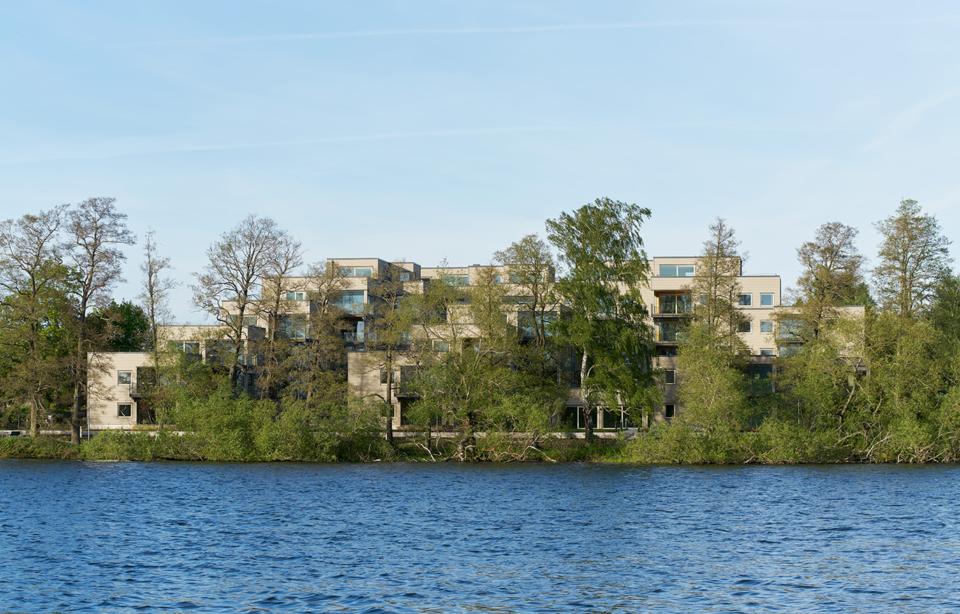 De tre huskropparna rymmer 43 lägenheter samt gemensamhetsutrymmen i form av pool, bastu och gym. Dessutom finns ett gemensamt soldäck med utsikt över Växjösjön som också nås genom gårdens två trappor som leder ner mot strandkanten. Tack vare den etageformade arkitekturen har samtliga lägenheter utsikt över sjön och egen uteplats i sydvästläge. Arkitekterna har haft ambitionen att ta tillvara läget med utsikt över två sjöar och att anpassa bebyggelsen till den närliggande naturen, ett tema som syns redan i gårdsmiljön där gröna ytor har skapats på terrassbjälklaget ovanpå det underjordiska garaget.