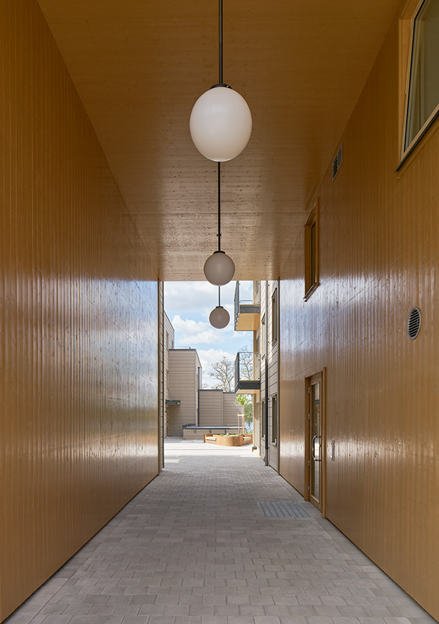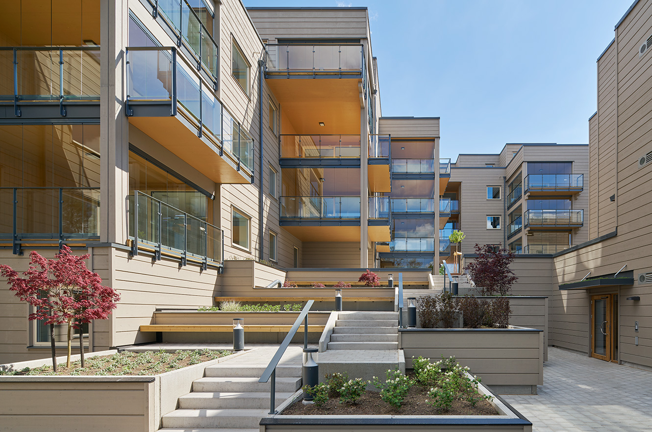 I en stad som satsar på hållbart byggande var det för Arkitektbolaget ingen tvekan om att Växjös nya flerbostadshus skulle byggas i trä. Hela stommen, utom källaren, är av trä. Väggarna och bjälk-lagen består av prefabricerade kl-träskivor och fasaderna är av bred limträpanel. Panelen är horisontellt placerad och målad i en varmgrå kulör.