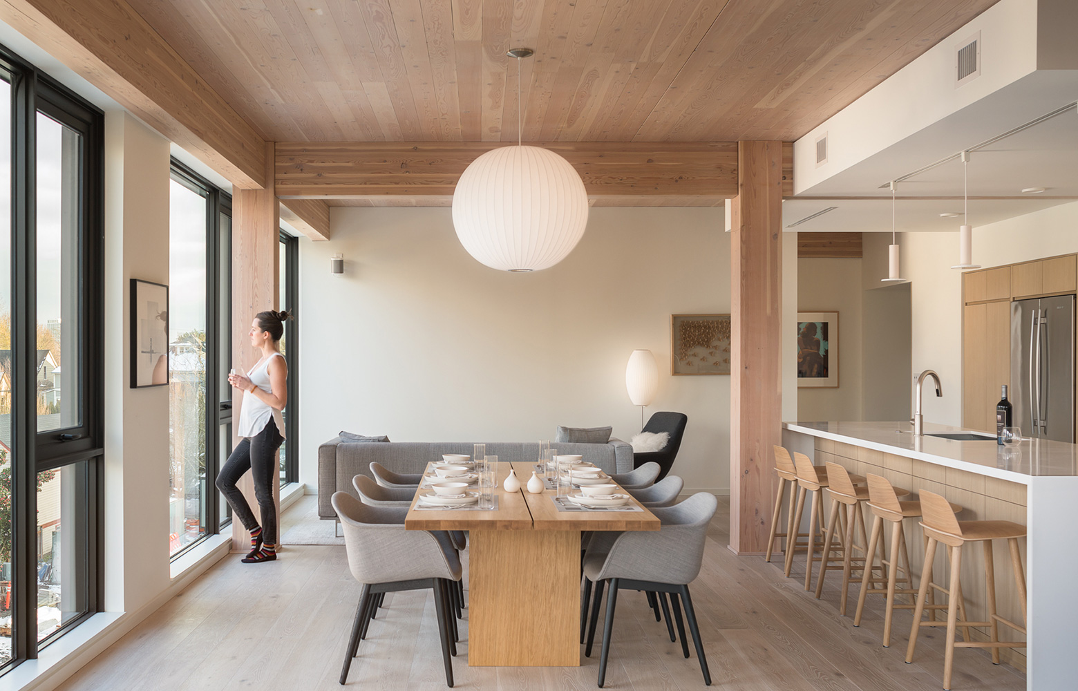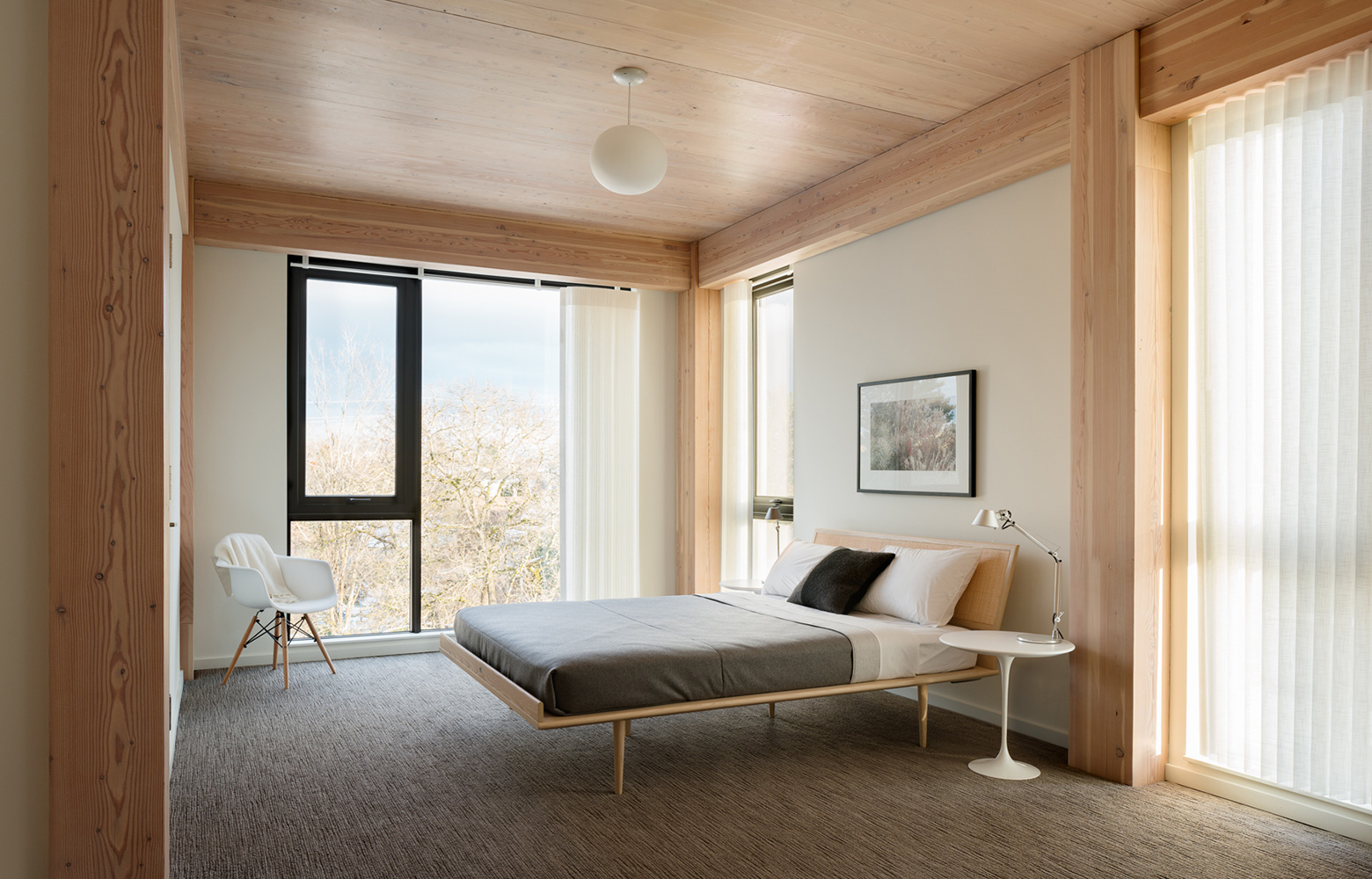 Hållbarhetsaspekten blev avgörande när Kaiser Group och Path Architecture valde materialet, som de har hämtat från Kanada. Men det synliga träet i golv, tak och pelare ger sannolikt också boende och besökare inspiration att leva hållbart. Fasadens brunmålade trä tillsammans med generösa fönster ger byggnaden ett både elegant och hållbart uttryck. Därutöver har taket också försetts med solceller.