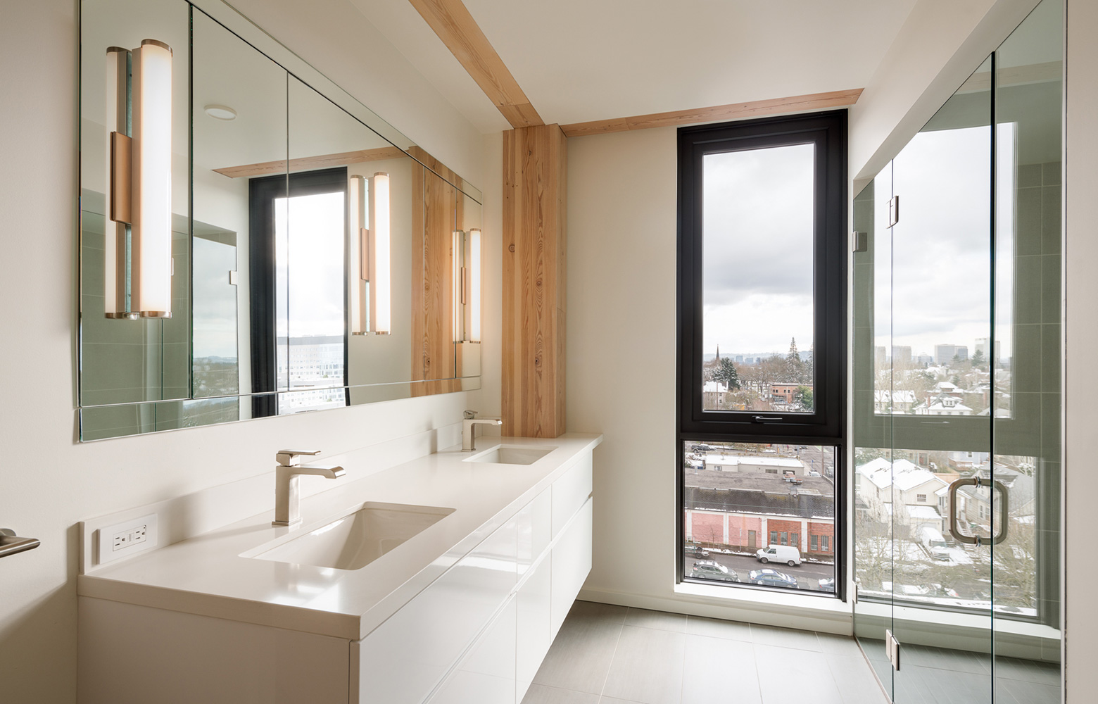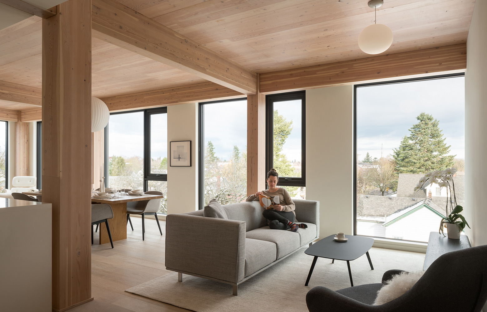 Säg USA och många tänker skyskrapor. Men trots att landet är känt för sina höga hus finns det ingen riktig tradition av att bygga hus högre än 3–4 våningar av trä. Nu börjar det emellertid bli ändring på det, och nyligen fick Portland i Oregon landets hittills högsta byggnad av KL-trä. Det nästan 26 meter höga huset rymmer 8 våningar bostäder.