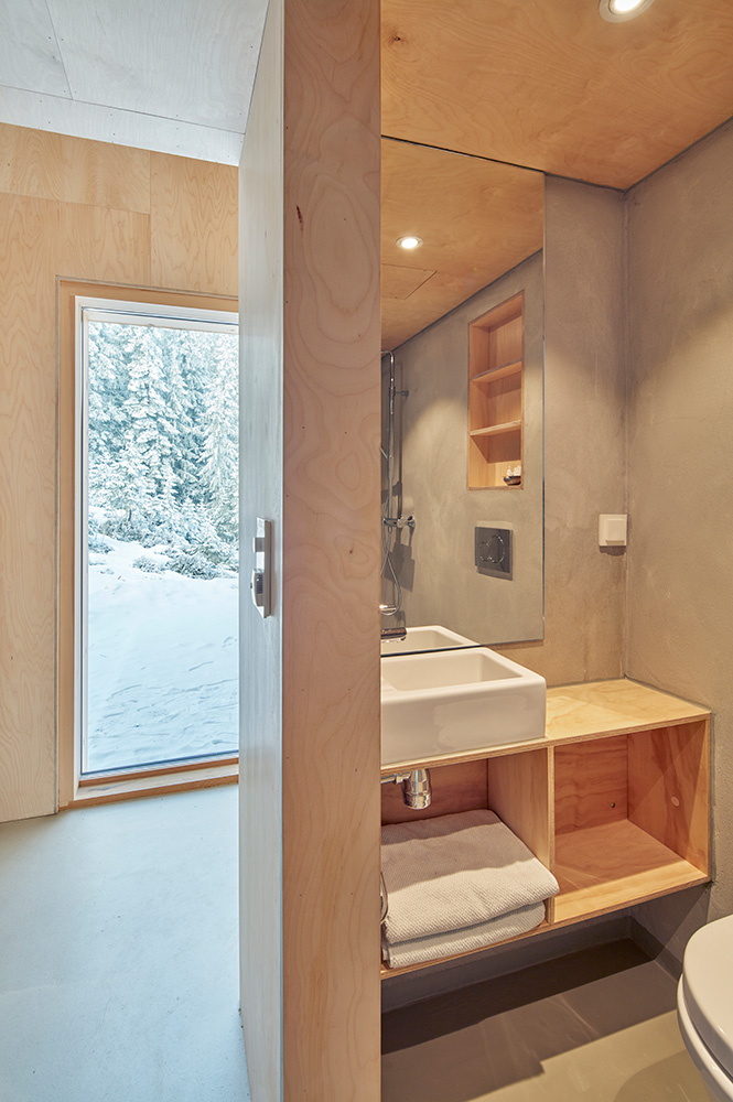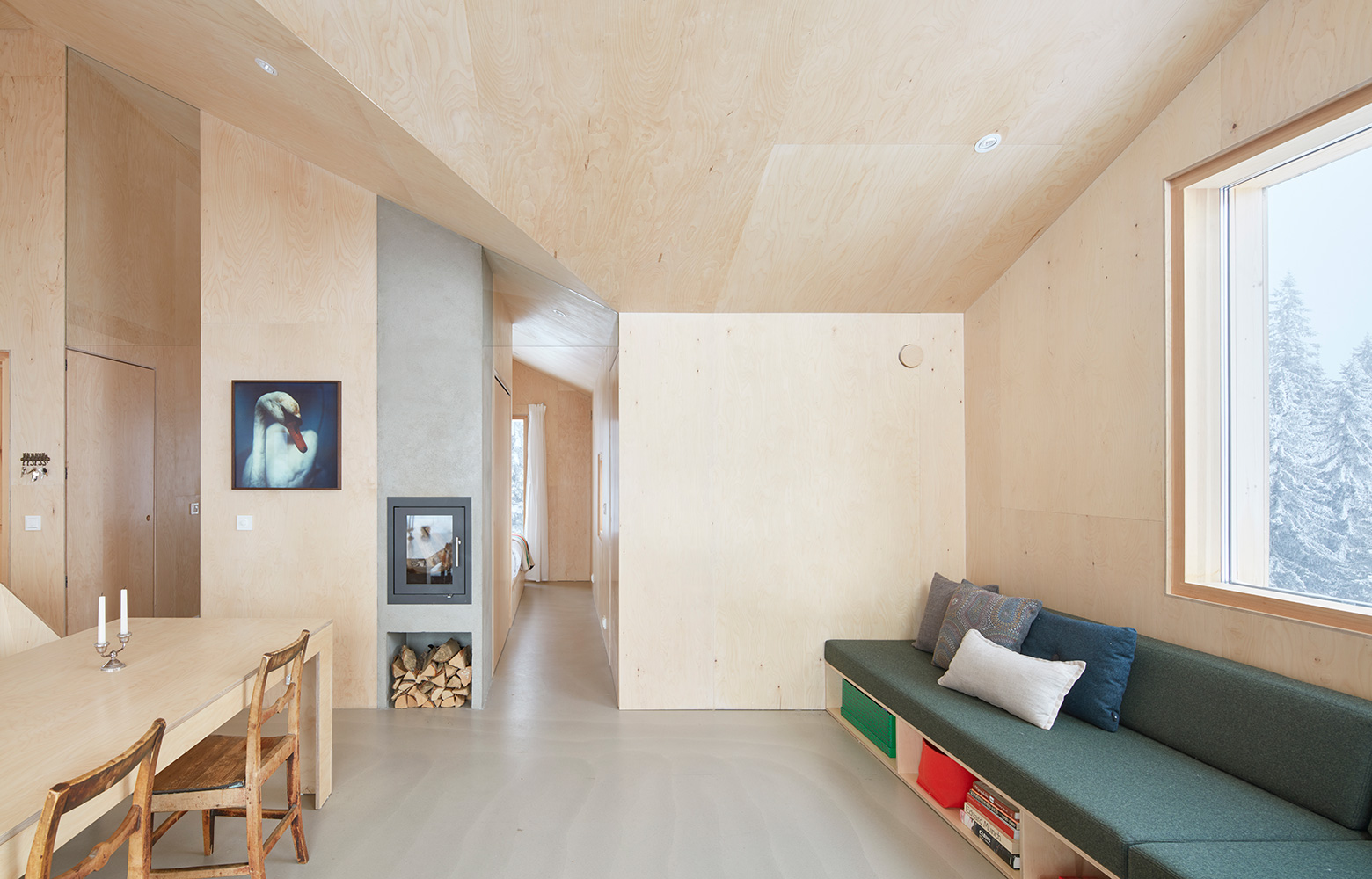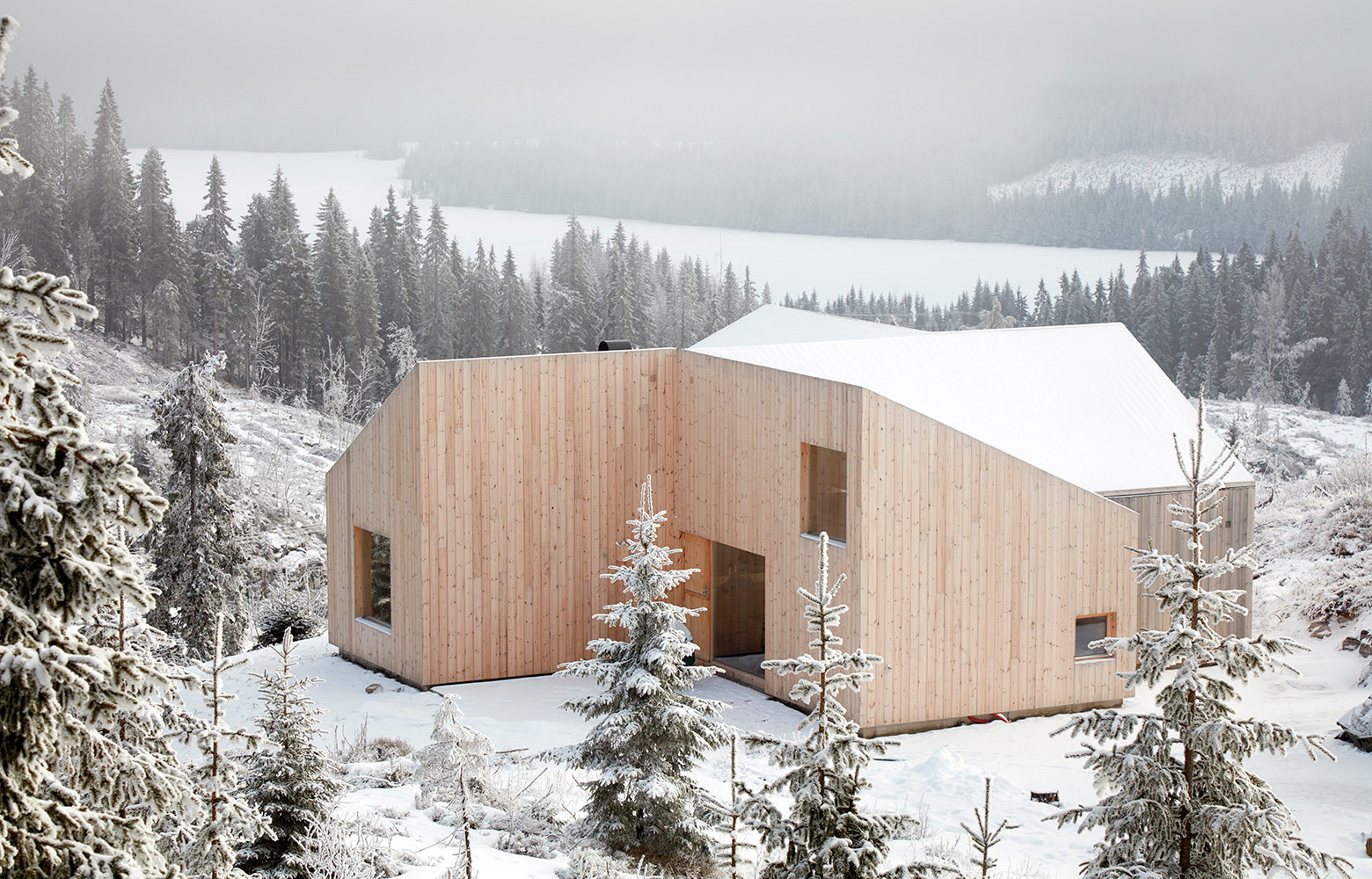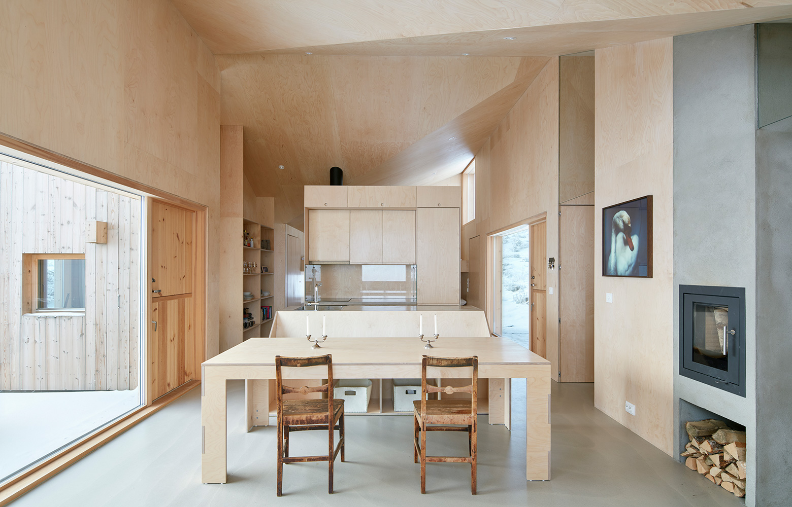 Resultatet blev en enkel byggnad, utvecklad ur hytten men med en extra twist. I stället för att skapa en rektangulär byggnad valde arkitekterna att utgå från en kärna i mitten, varifrån fyra enheter likt kronbladen på en blomma skapar en multiform och ger två terrasser i olika väderstreck. Utformningen ledde till att det sadeltak som detaljplanen förespråkar här fick ersättas med ett pulpettak. Fasaden är klädd med obehandlad kärnfuru som med hjälp av det norska vädret kommer att anta en grå, vindpinad nyans. Furu är även synligt i en stor del av inredningen, där både väggar och tak är av vitoljad furuplywood.«