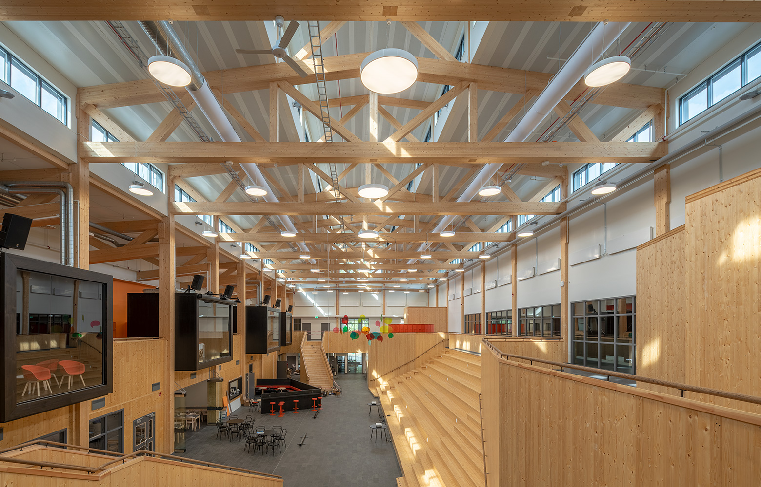 I ljusgården och sporthallen består både stomme och ytskikt av trä ända ner till golvet. I klassrum och matsalar har man däremot låtit en stålstomme bära en första våning av betonghåldäck. Det fanns en önskan om att gömma stommen i mellanväggarna för dessa utrymmen vilket kunde utformas enklare med stålpelare. Ovanpå det kommer en limträstomme och därefter träfackverk på de flesta av stomlinjerna. Genom att kombinera limträstommen med KL-trä har man också kunnat skapa en extra stark konstruktion som klarar de stora spännvidderna – som mest handlar det om 26 meter.